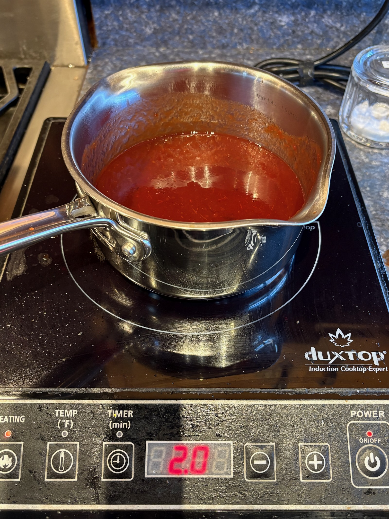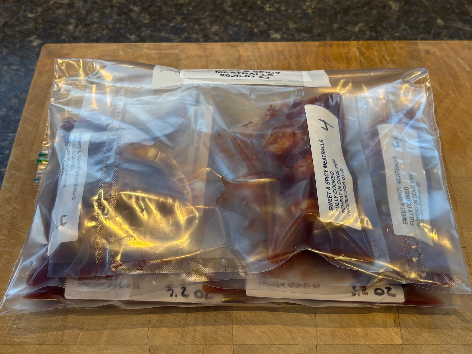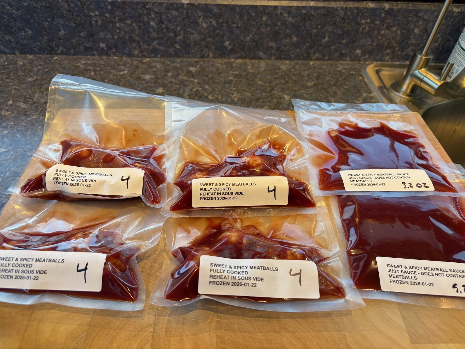 Instead of cooking the meatballs, I chilled the sauce, then added it to vacuum bags with 4 frozen meatballs each. There's 2-3 oz. of sauce in each bag.