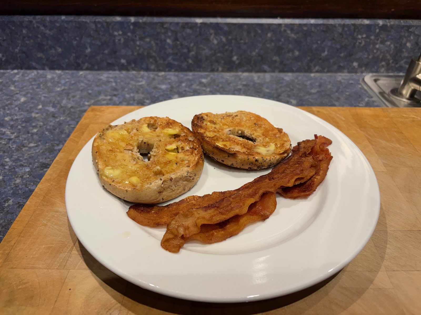 Breakfast: Toasted everything bagel with butter. Side of bacon.