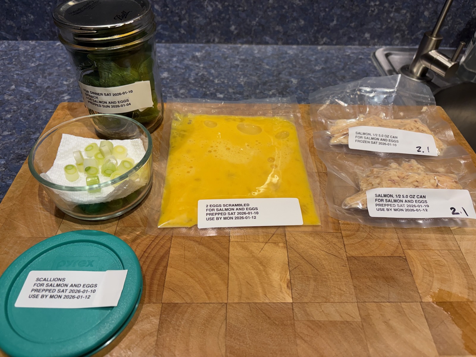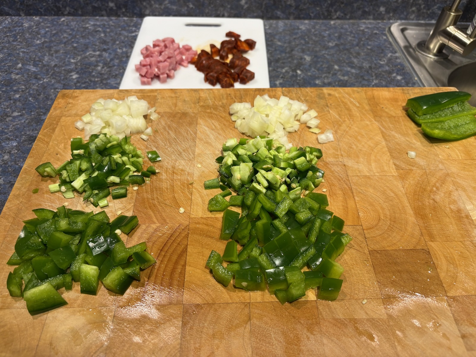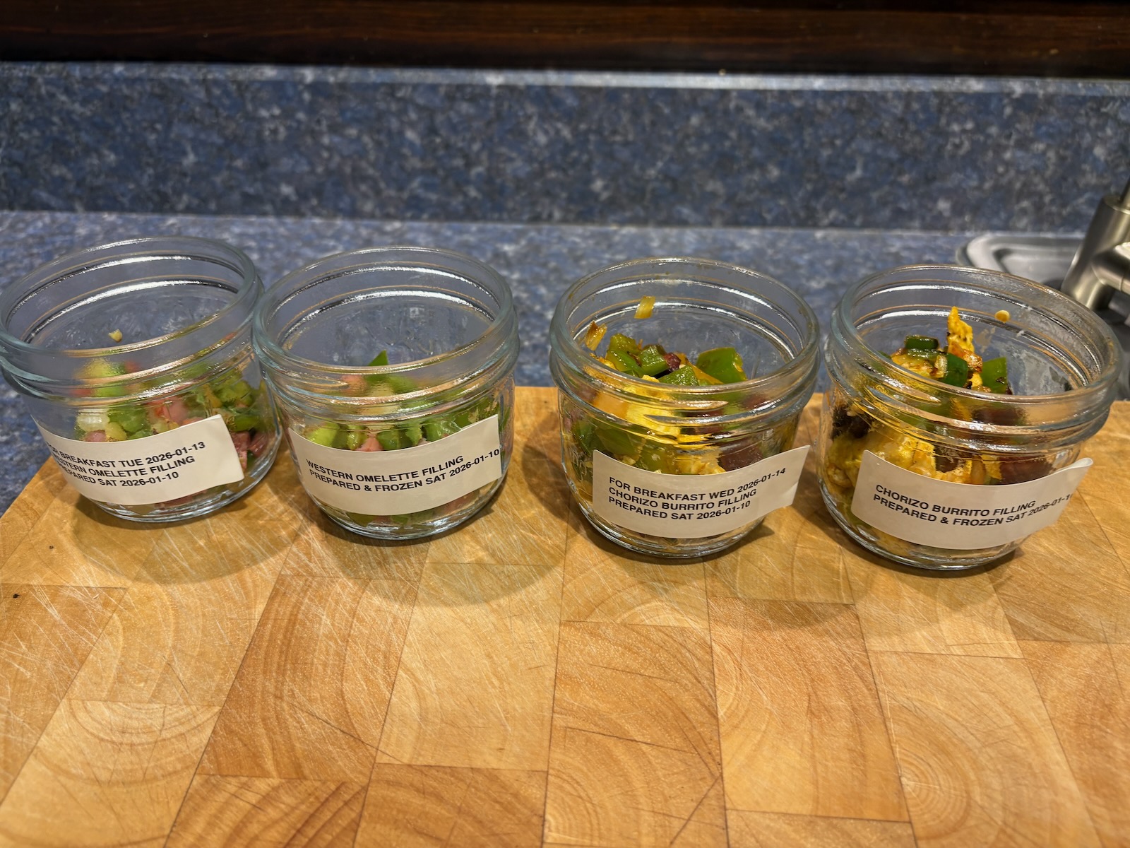 Made the filling for an spicy western omelette for Tuesday. And the filling for chorizo breakfast burrito with chorizo, onion, green pepper, jalapeño, and egg for breakfast Wednesday. Froze the serving for next Friday.