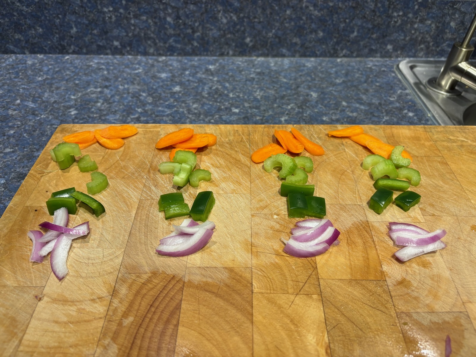 Prepped 4 servings of salad veggies. With carrot, celery, green pepper, red onion. 1 extra serving for lunch Sunday.