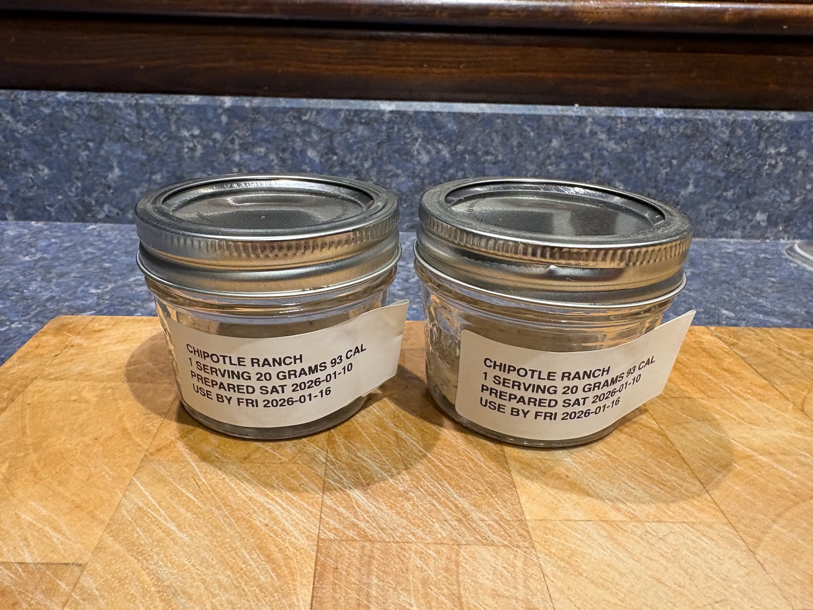 Prepped 2 servings of chipotle ranch salad dressing, 20 grams, 93 calories each.