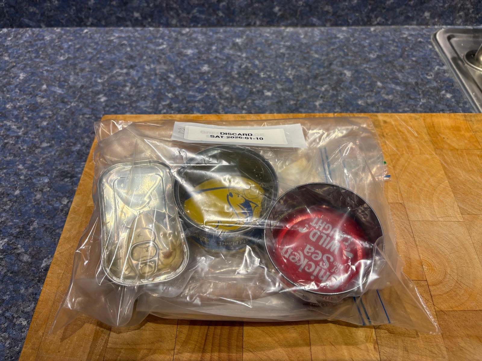 Some of this is recyclable, but poses other issues, like what do I do with the oil in the mackerel tin, and it's impossible to get all of the tuna residue out of the can. I hate it when my recycling smells bad, and actually that also extends to trash so anything that might smell or leak is frozen until trash day.