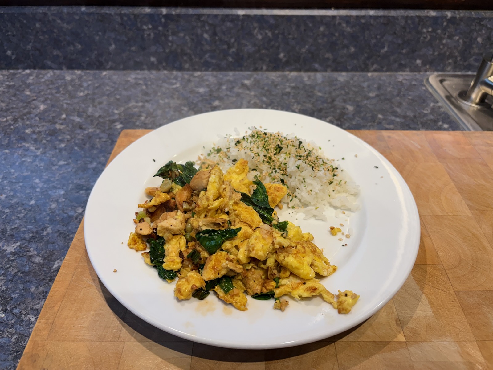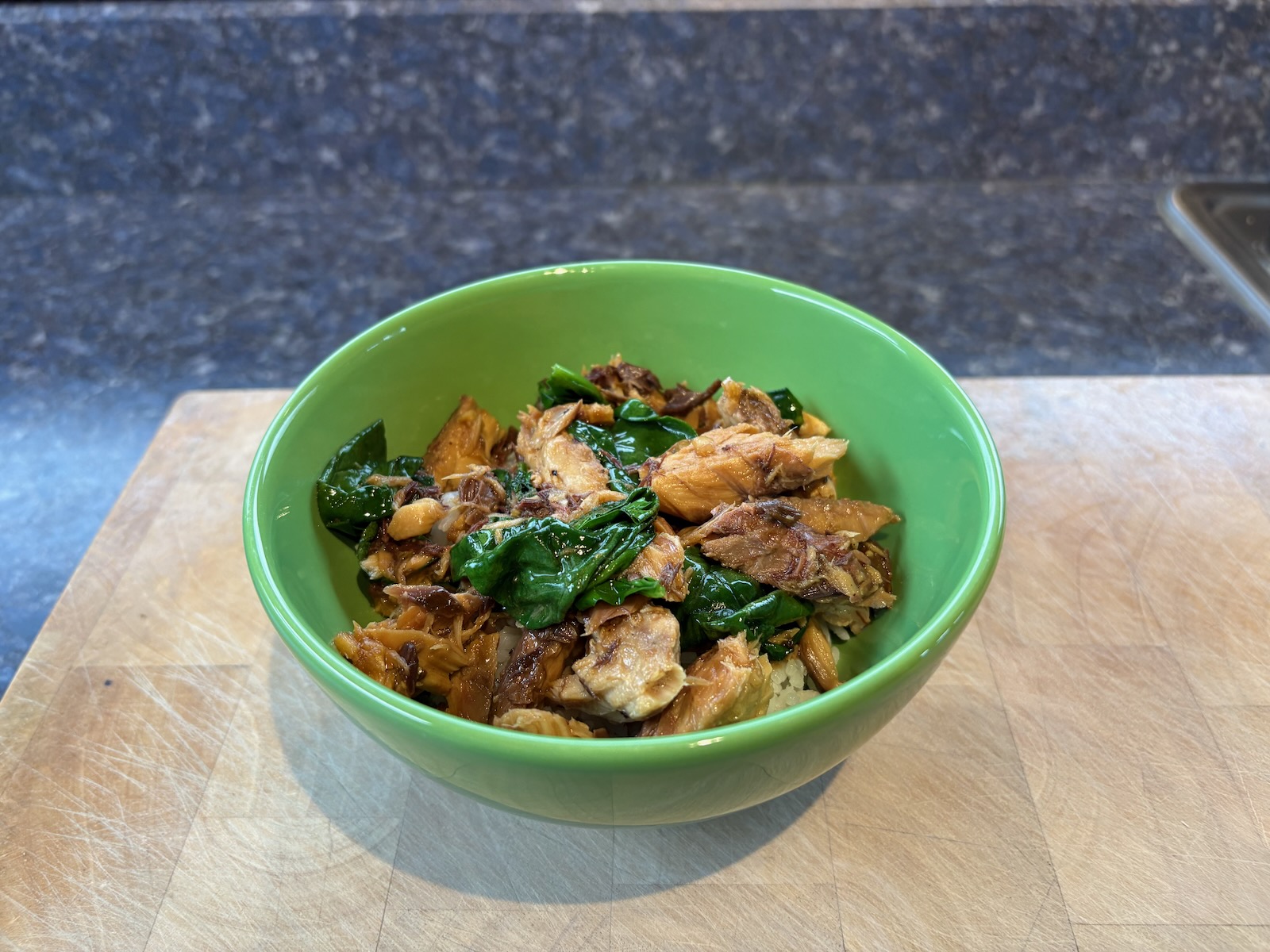 Dinner: Salmon and eggs stir-fry with spinach. A half glass of Bota Box sauvignon blanc.