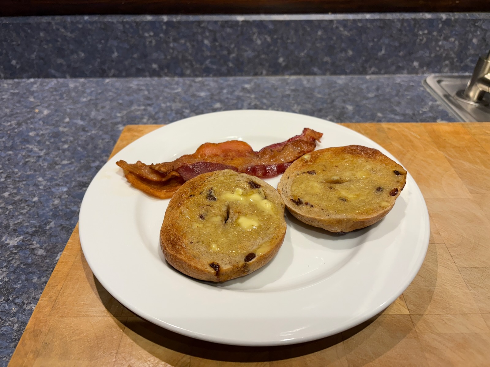 Breakfast: Toasted blueberry bagel with butter. Side of bacon.