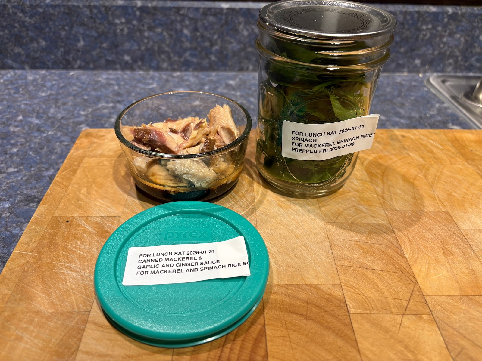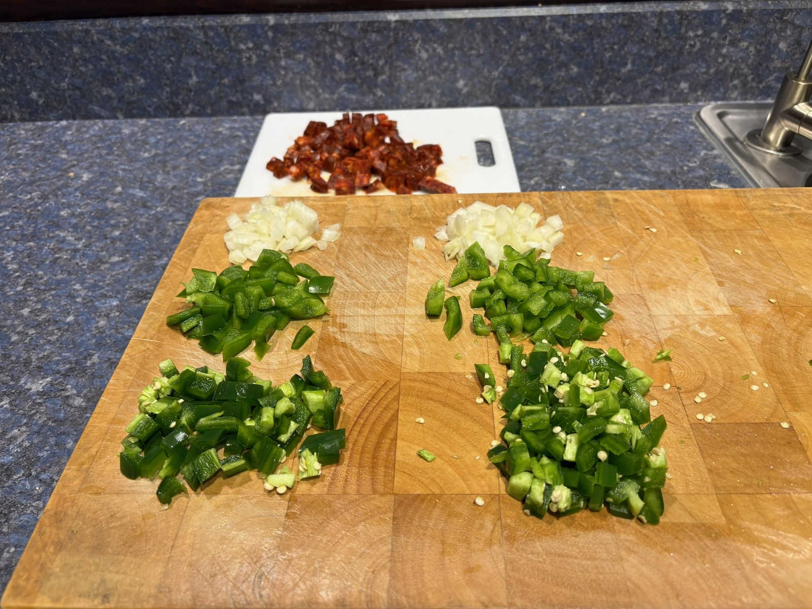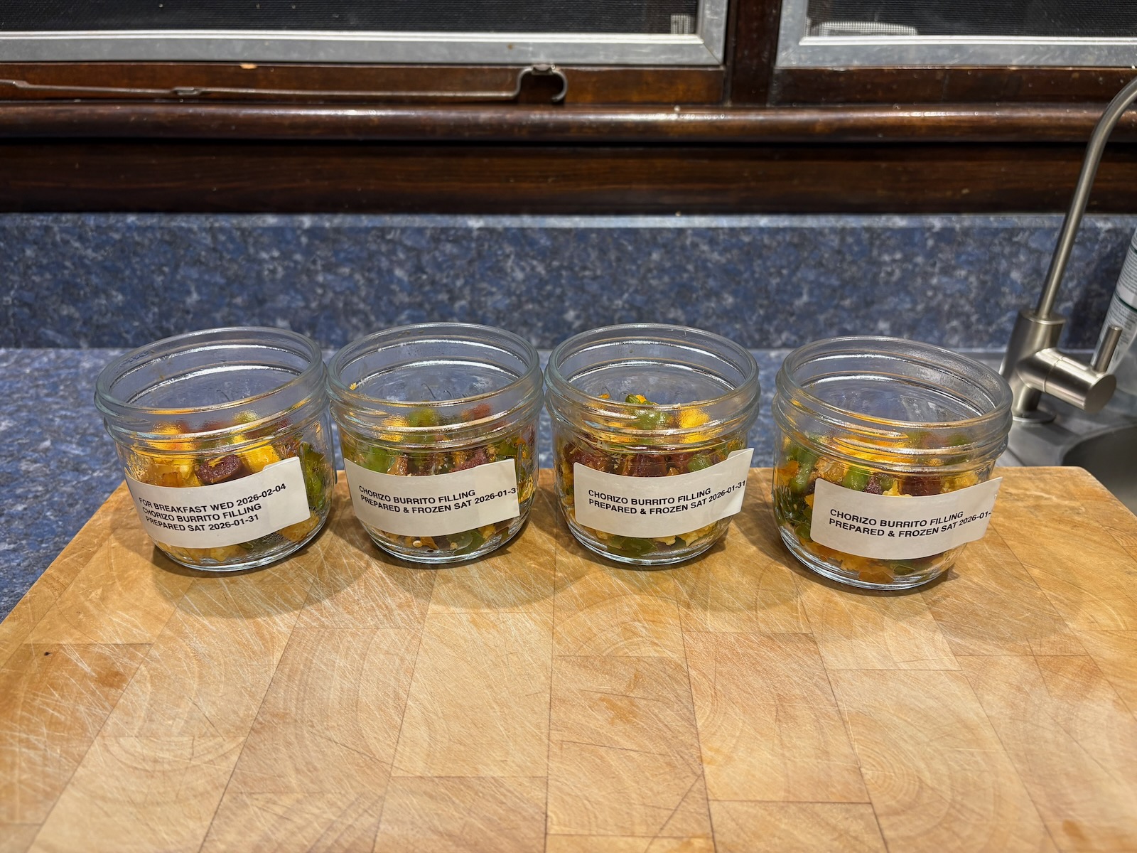 Made a double batch of the filling for chorizo breakfast burrito with chorizo, onion, green pepper, jalapeño, and egg for breakfast Wednesday. Froze three servings.