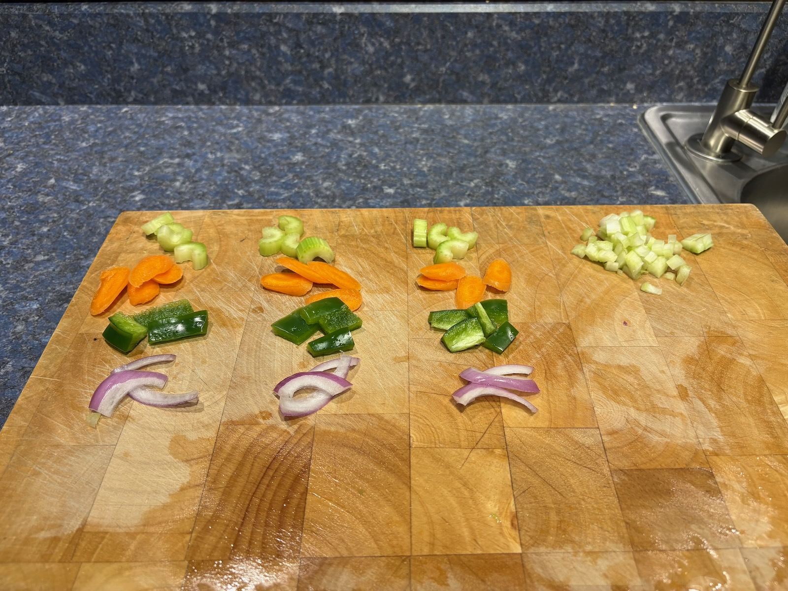 Prepped salad veggies. With carrot, celery, green pepper, red onion.