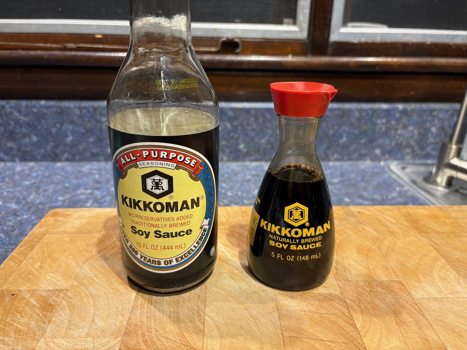 Refilled my soy sauce container. The larger bottle on the left is refrigerated, and I use it to fill the dispenser on the right, which stays at room temperature.
