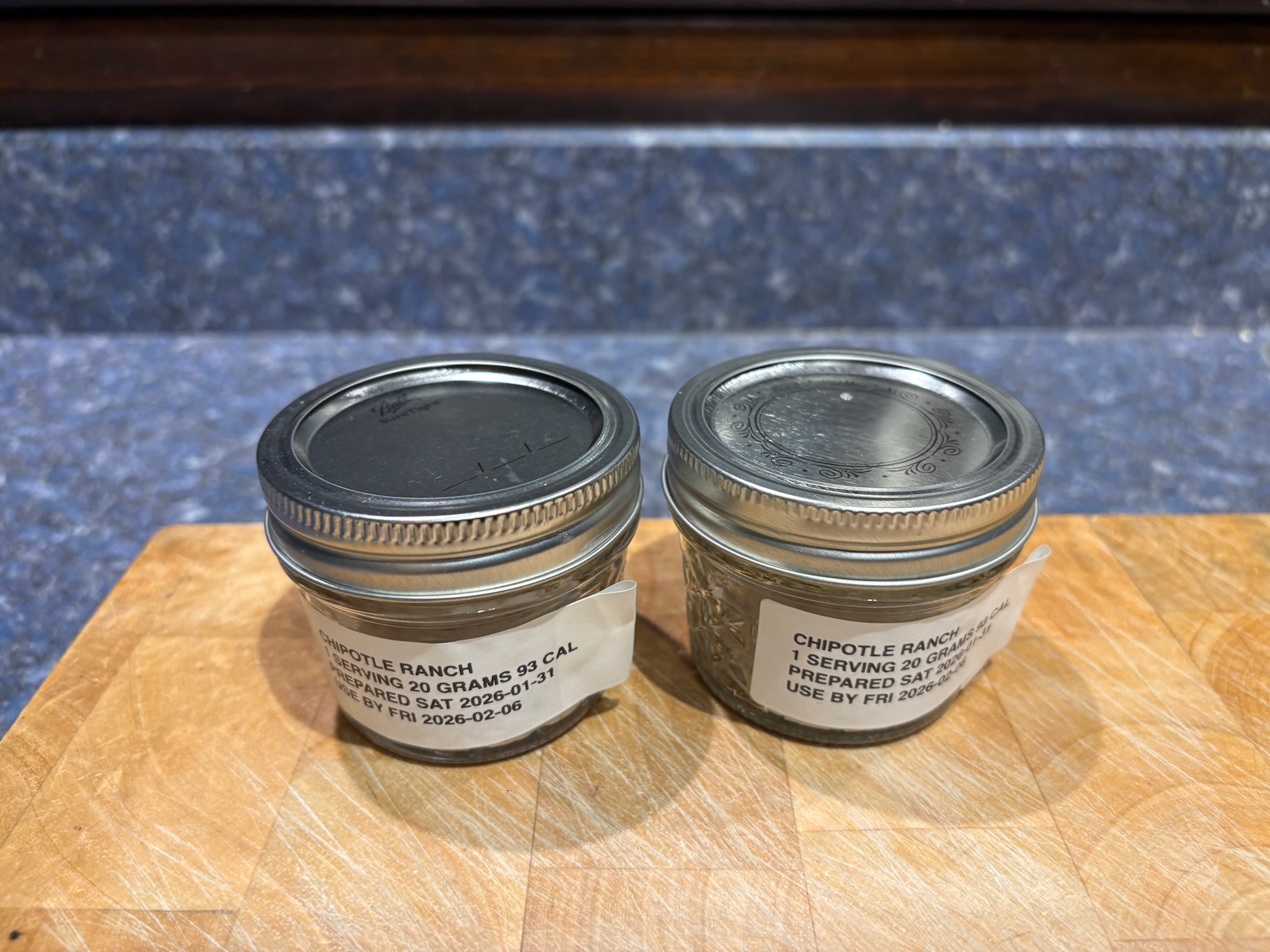 Prepped 2 servings of chipotle ranch salad dressing, 20 grams, 93 calories each.