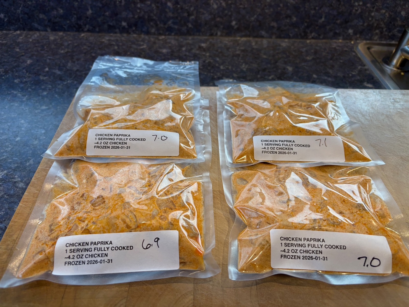 Made a batch of Chicken paprika #5 (updated recipe). Started with a 1.48 lb. (23.7 oz.) package of boneless, skinless chicken thighs. Vacuum sealed and froze 4 servings.