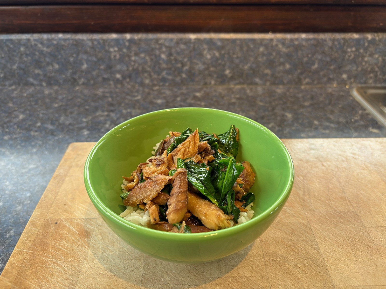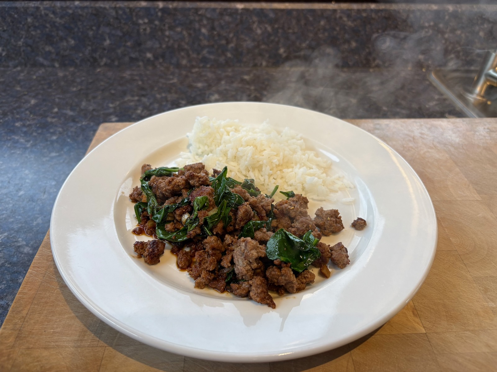 Dinner: Crushed hamburger (4.0 oz. before cooking) with spinach and rice. A half glass of Bota Box malbec.