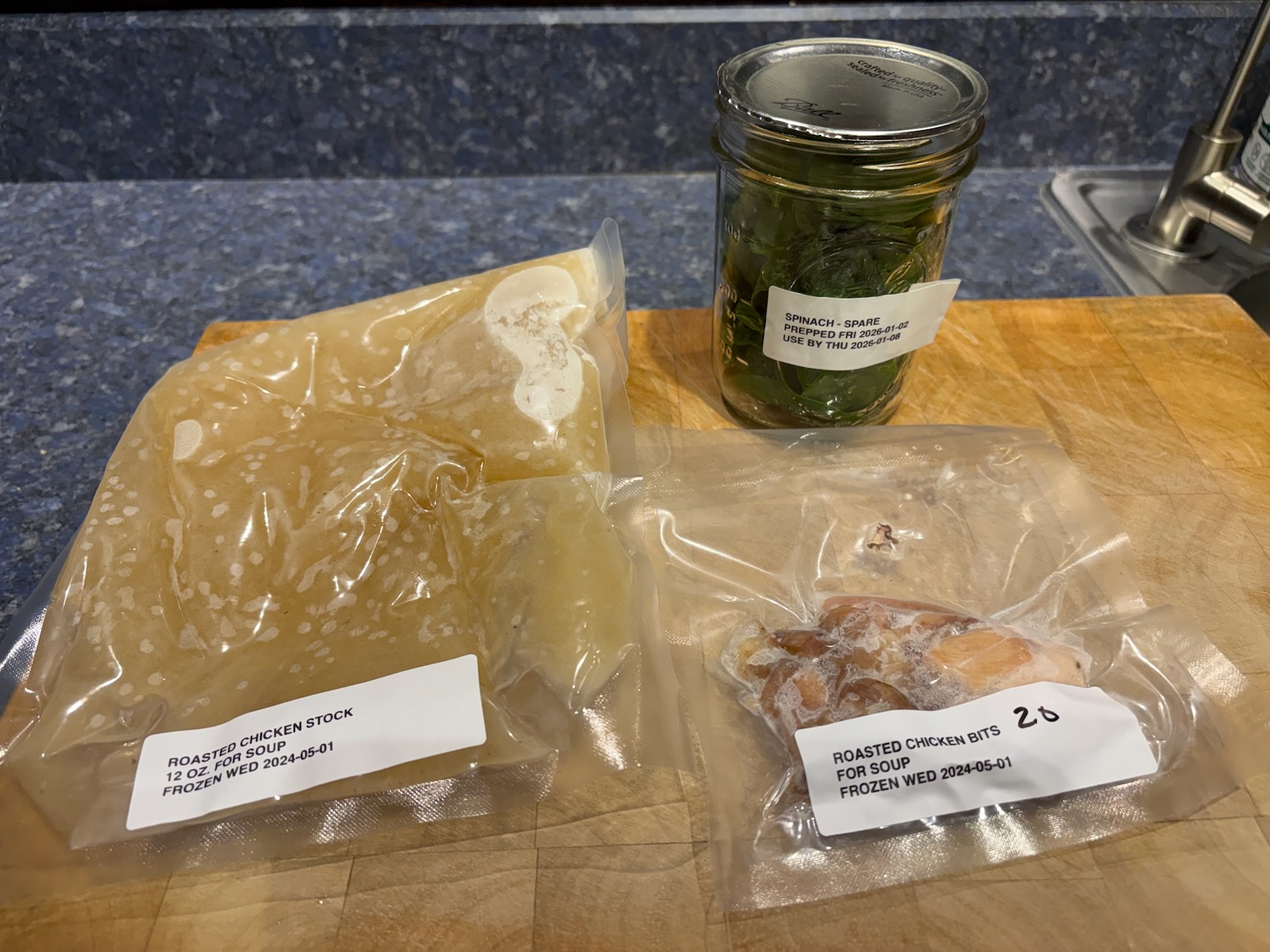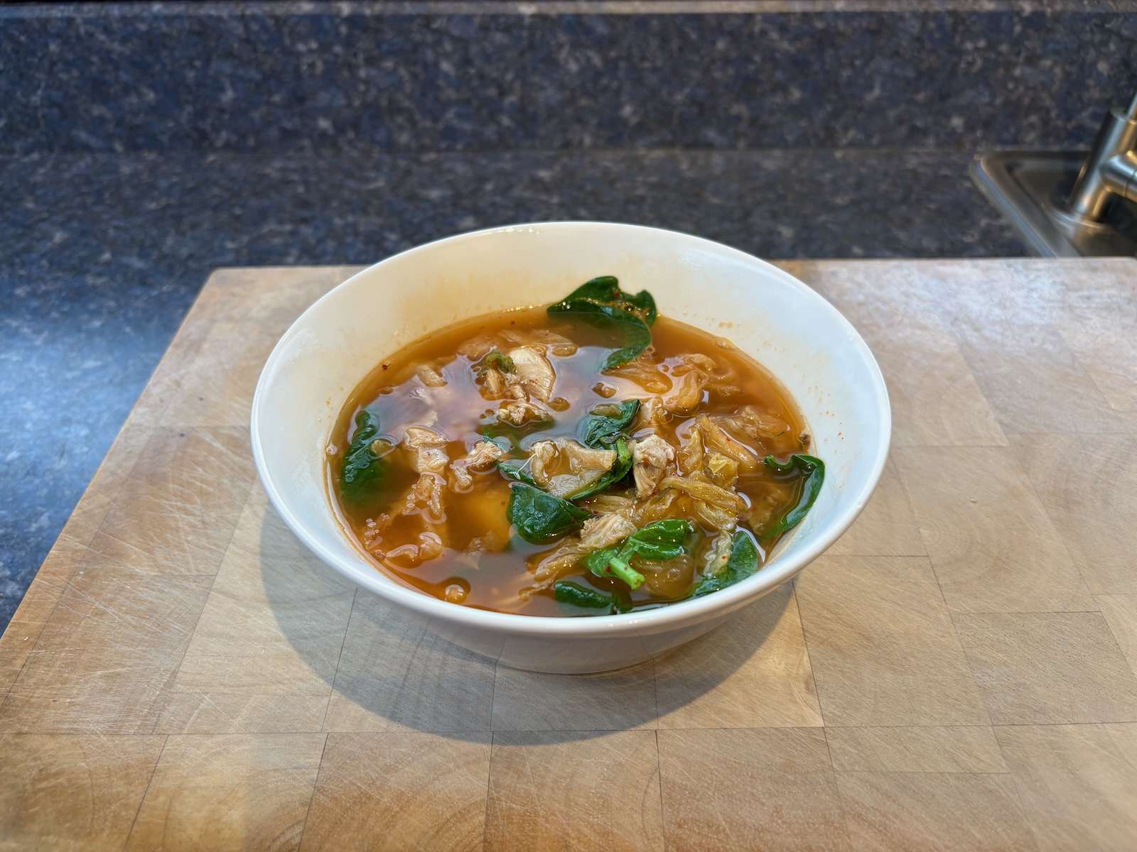 Lunch: Chicken kimchi soup. With 12 oz. chicken stock, 2.0 oz. chicken, kimchi, and spinach. A half glass of Bota Box sauvignon blanc.