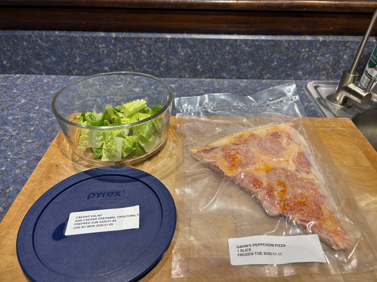 Dinner: 1 slice of pepperoni pizza from Gavin's in Sidney, NY. It was vacuum sealed and frozen so I reheated it from frozen in the sous vide at 140°F, then transferred it to the Breville SmartOven, 400°F for 3 minutes, plus the preheat time, on a sheet pan.