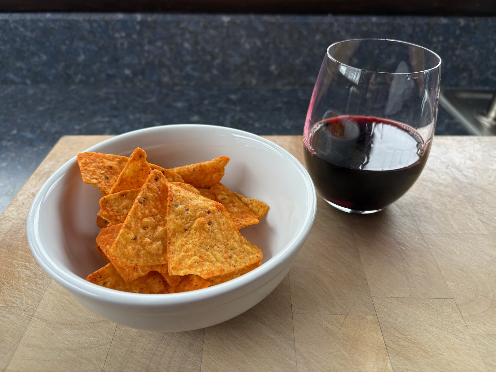 Snack: 2.0 oz. Doritos and a glass of Bota Box cabernet sauvignon. A Founder's All Day IPA.