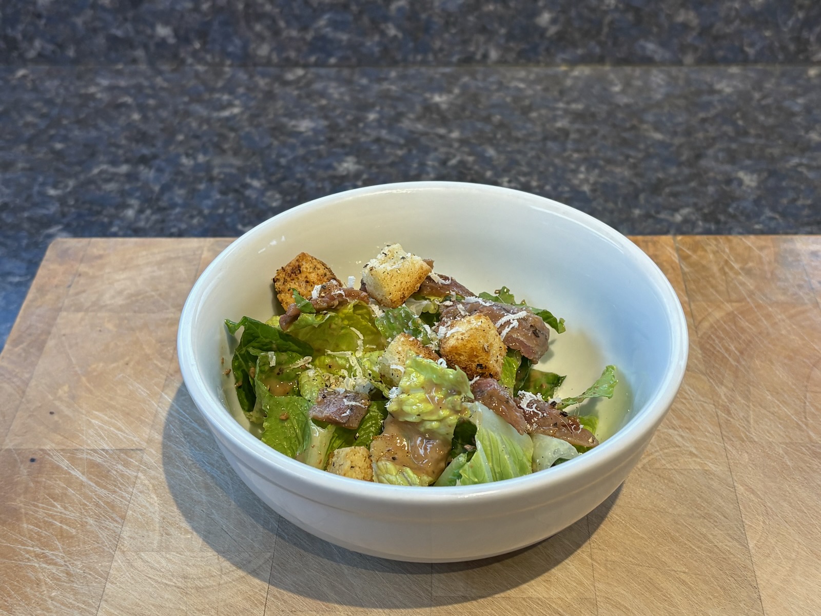 Pre-dinner: A side Caesar salad. A glass of Bota Box cabernet sauvignon.