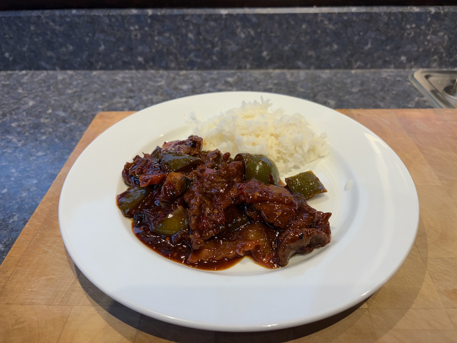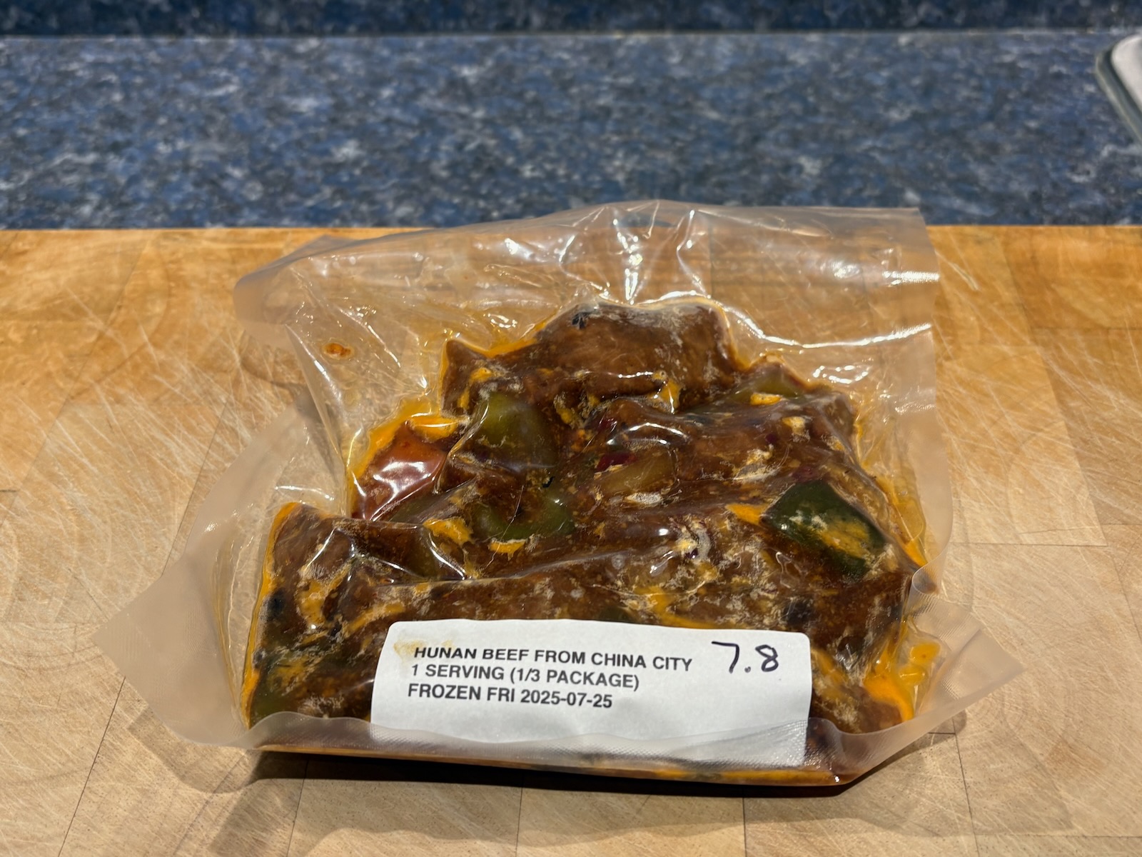 Dinner: Hunan beef from China City in Sidney, NY. 7.8 oz. serving. Previously vacuum sealed and frozen. Half glass of Bota Box malbec.