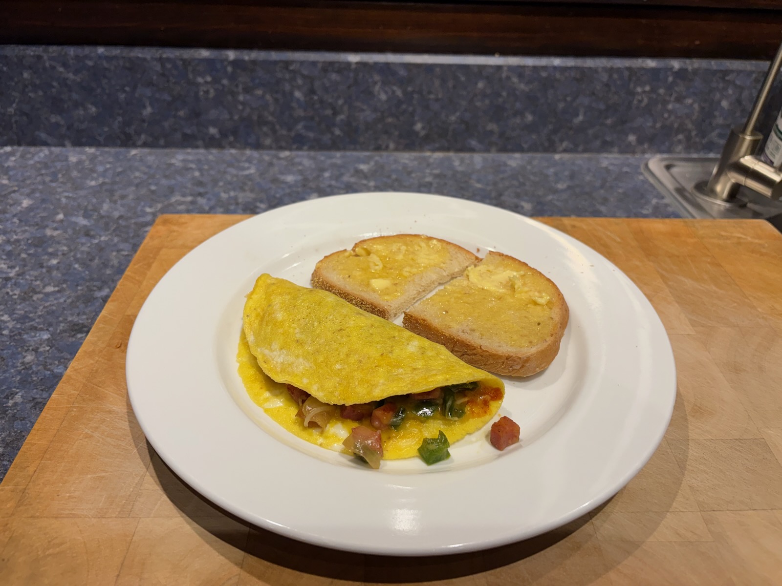 Breakfast: Spicy western omelette. Filling cooked Sunday and reheated, in 1 egg, freshly cooked. And Heidelberg French peasant bread toast with butter.