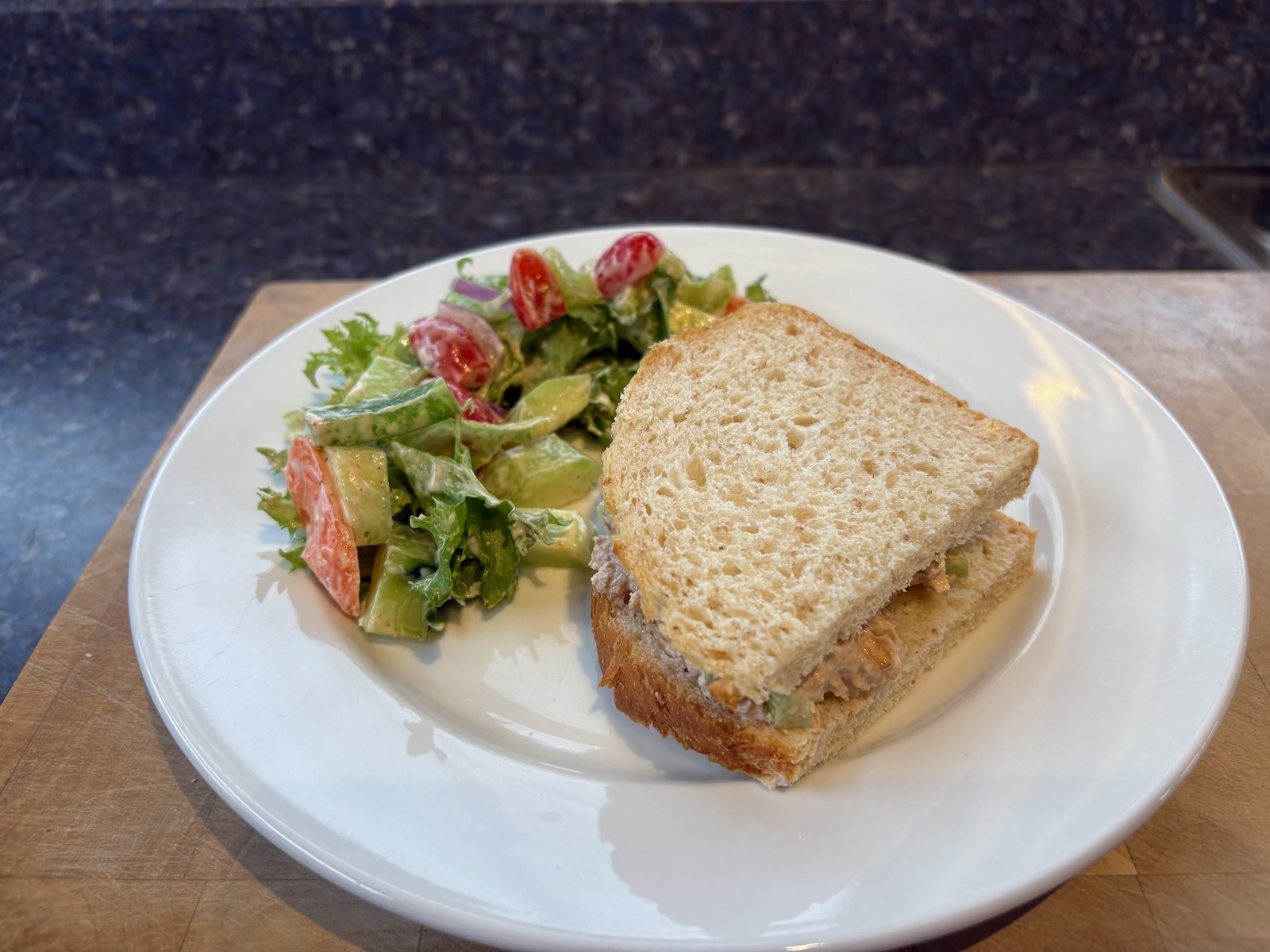 Lunch: Spicy tuna salad sandwich on Heidelberg French peasant bread. Salad with lettuce mix, cucumber, tomato, carrot, celery, green pepper, red onion, and chipotle ranch dressing (20 grams, 93 cal).