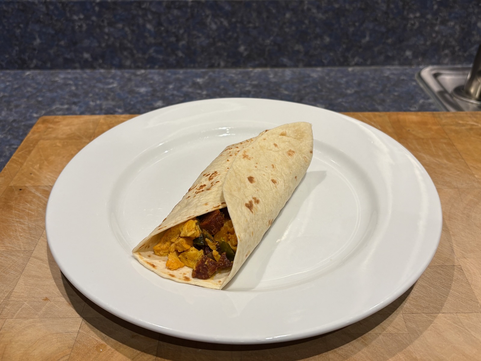 Breakfast: Chorizo breakfast burrito with chorizo, onion, green pepper, jalapeño, and egg. Reheat of the filling I cooked Saturday and froze, in a freshly heated flour tortilla.