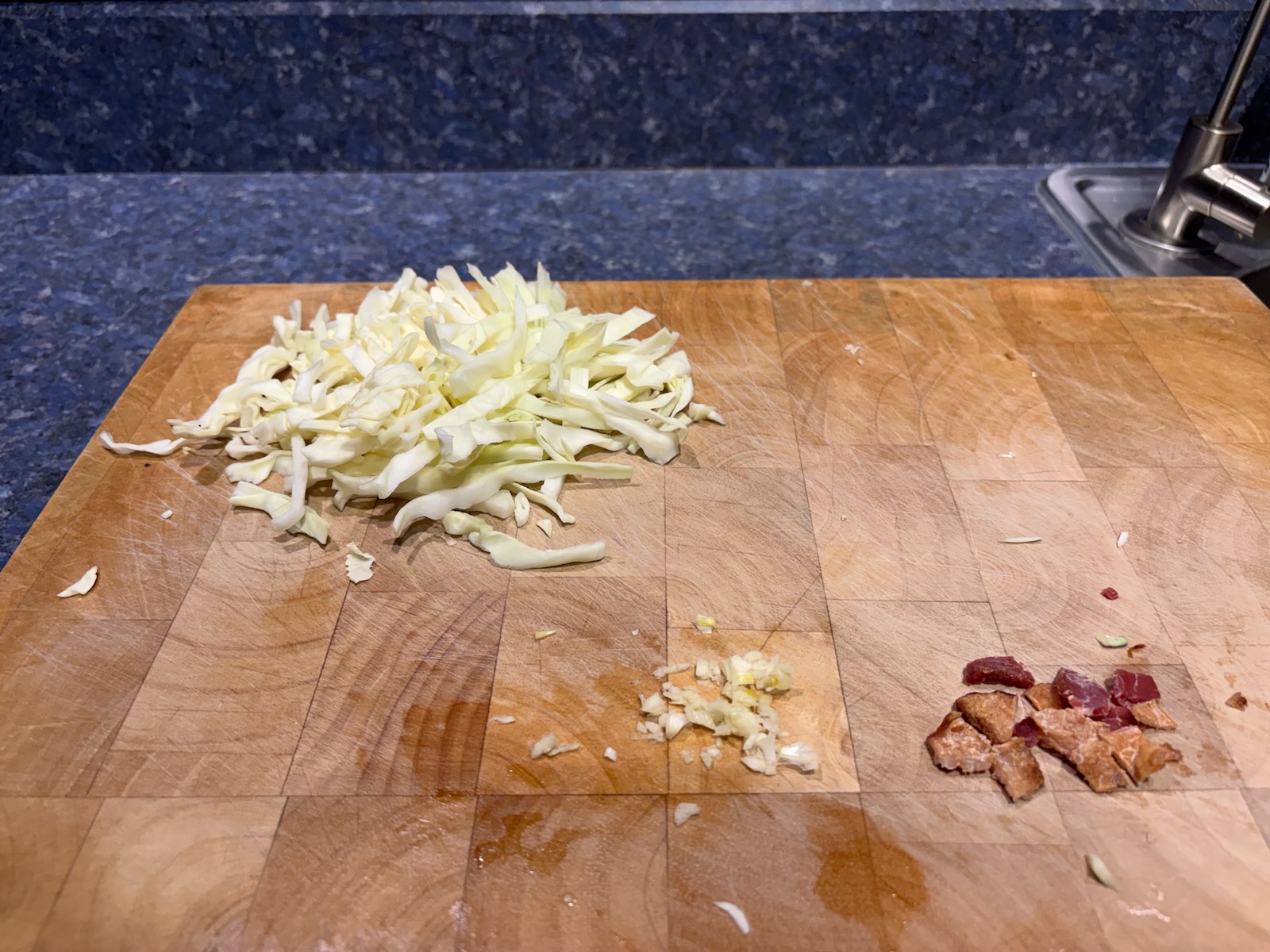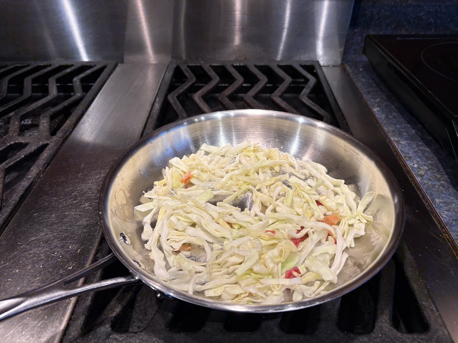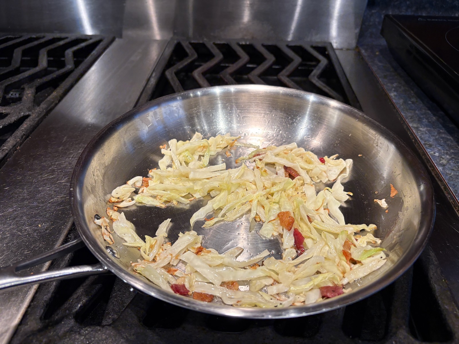 Made the sautéed cabbage for dinner. Since the low-fat 1980s Mom made it with just cabbage, cooked in olive oil, and that's the way I've always made it. But in the 1970s, it was made with bacon grease, and bacon. I tried making it that way today, and indeed, it's better!