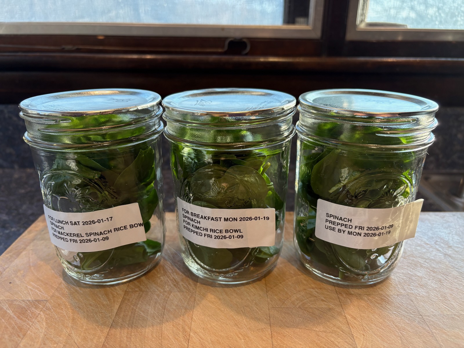 Prepped, vacuum sealed, and refrigerated jars of spinach. Good until Monday 2026-01-19.