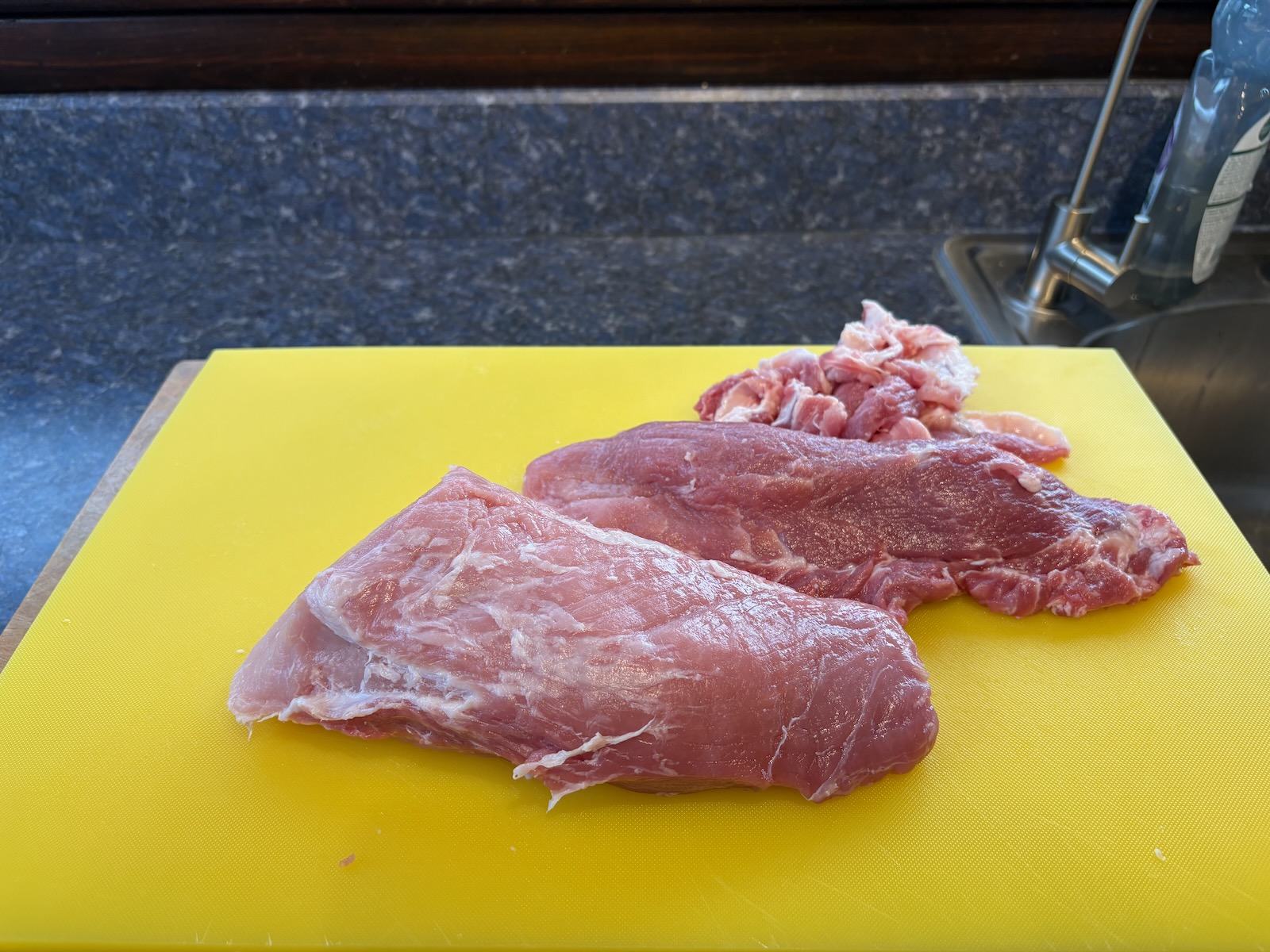 Cut into thin-sliced pork chops for tonkatsu, and also a mix of light and dark meat to freeze for another meal.
