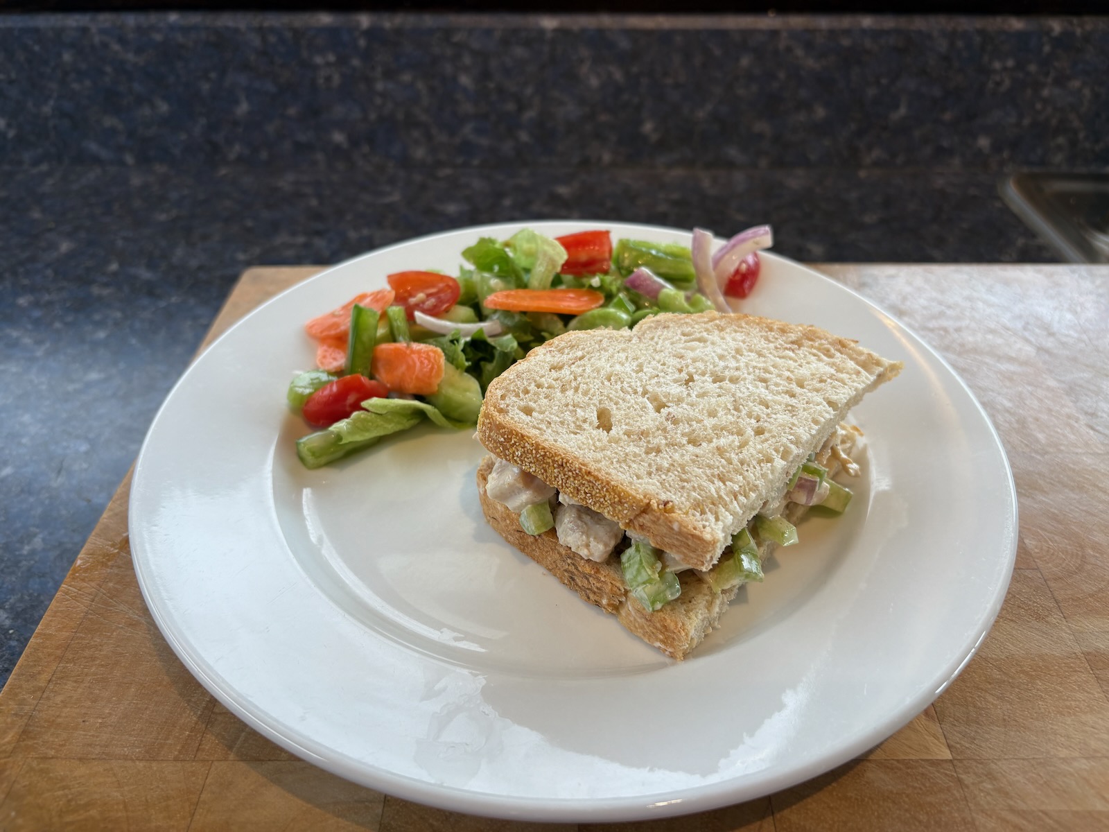 Lunch: Curry chicken salad sandwich with 2.0 oz. chicken on Heidelberg French peasant bread. Side salad with lettuce mix, cucumber, tomato, celery, red onion, and Annie's green goddess dressing.