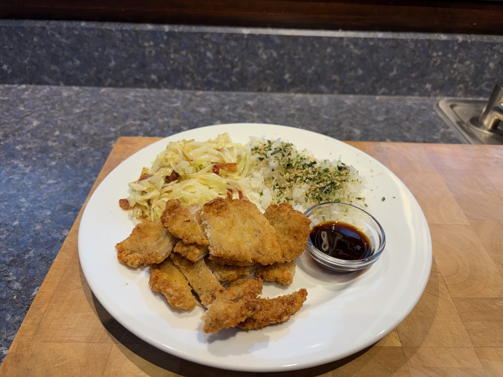 Dinner: Tonkatsu (4.2 oz.), rice, and sautéed cabbage. And a half glass of Bota Box sauvignon blanc.