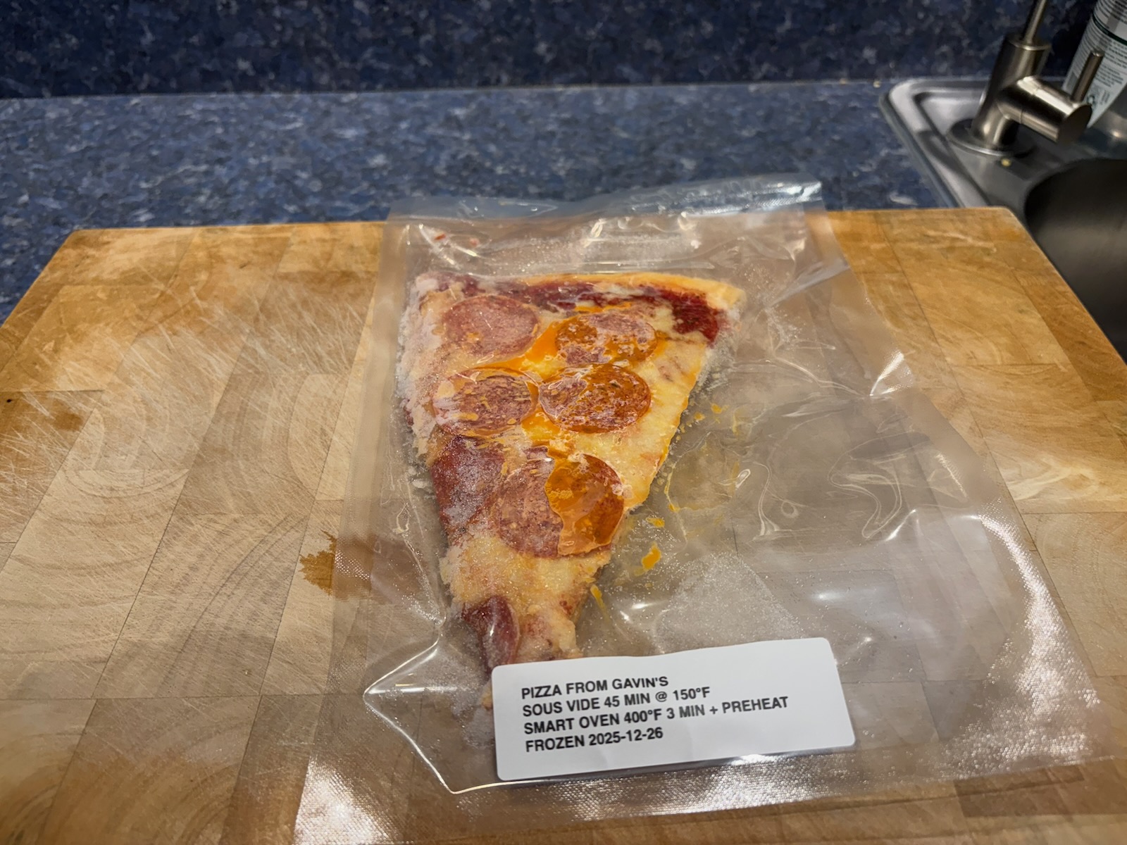 Dinner: 1 slice of Pepperoni pizza from Gavin's in Sidney, NY. It was vacuum sealed and frozen so I reheated it from frozen in the sous vide at 140°F, then transferred it to the Breville SmartOven, 400°F for 3 minutes, plus the preheat time, on a sheet pan.