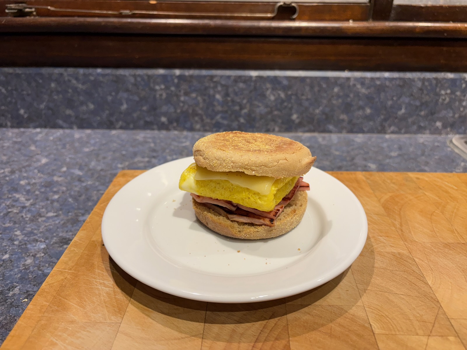 Breakfast: Ham, egg and cheese English muffin sandwich. With 2.2 oz. ham.