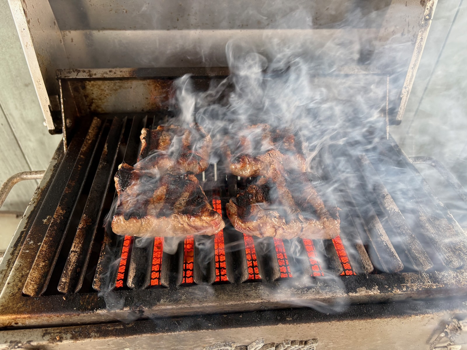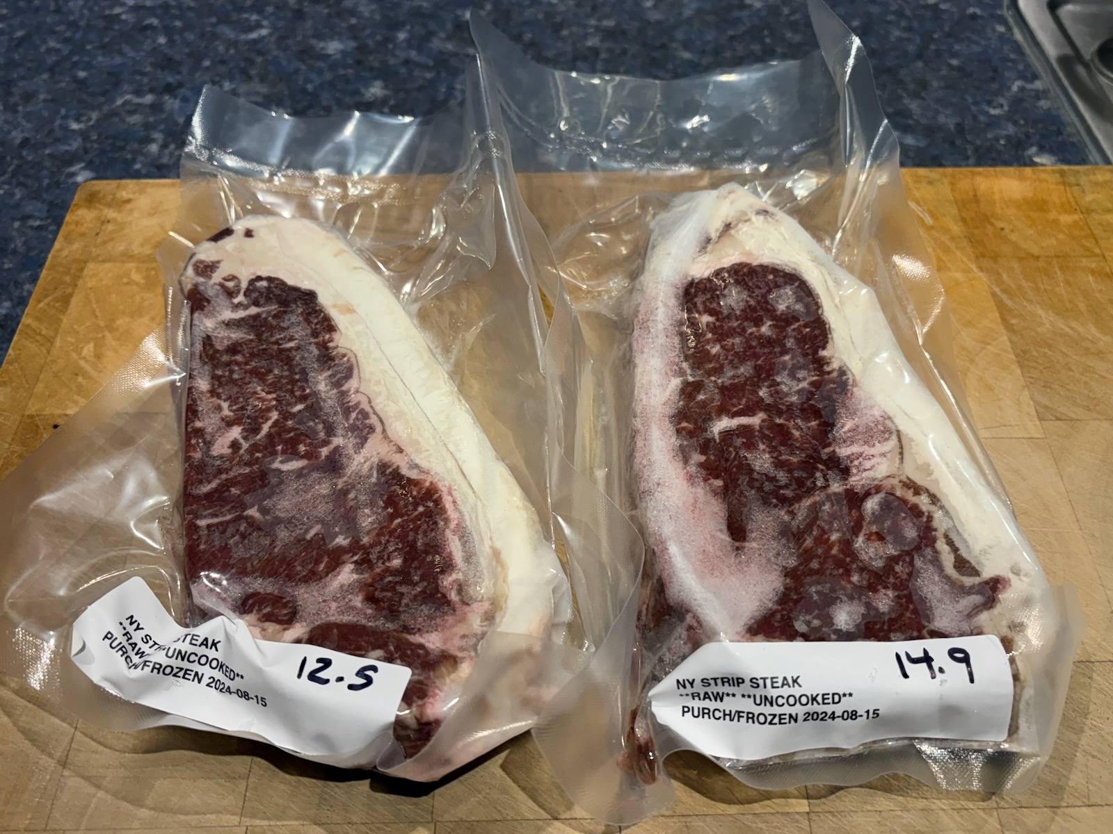 Grilled, vacuum sealed, and froze NY strip steaks. Kept one serving refrigerated for dinner Saturday.