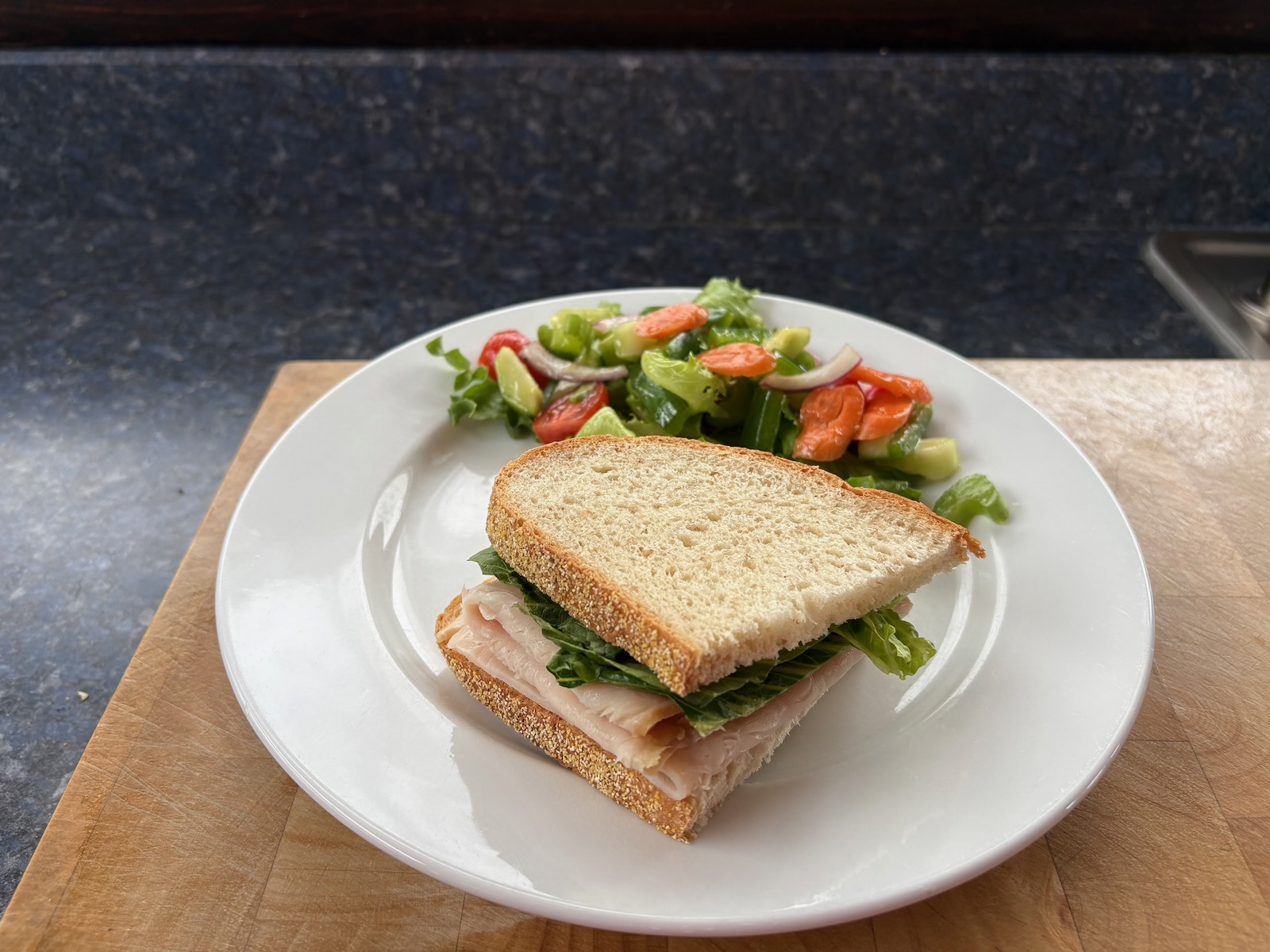 Lunch: Turkey sandwich with 2.5 oz. smoked turkey, lettuce, and mayo on Heidelberg French peasant bread. A side salad with lettuce mix, cucumber, tomato, carrot, celery, green pepper, red onion, and balsamic dressing.