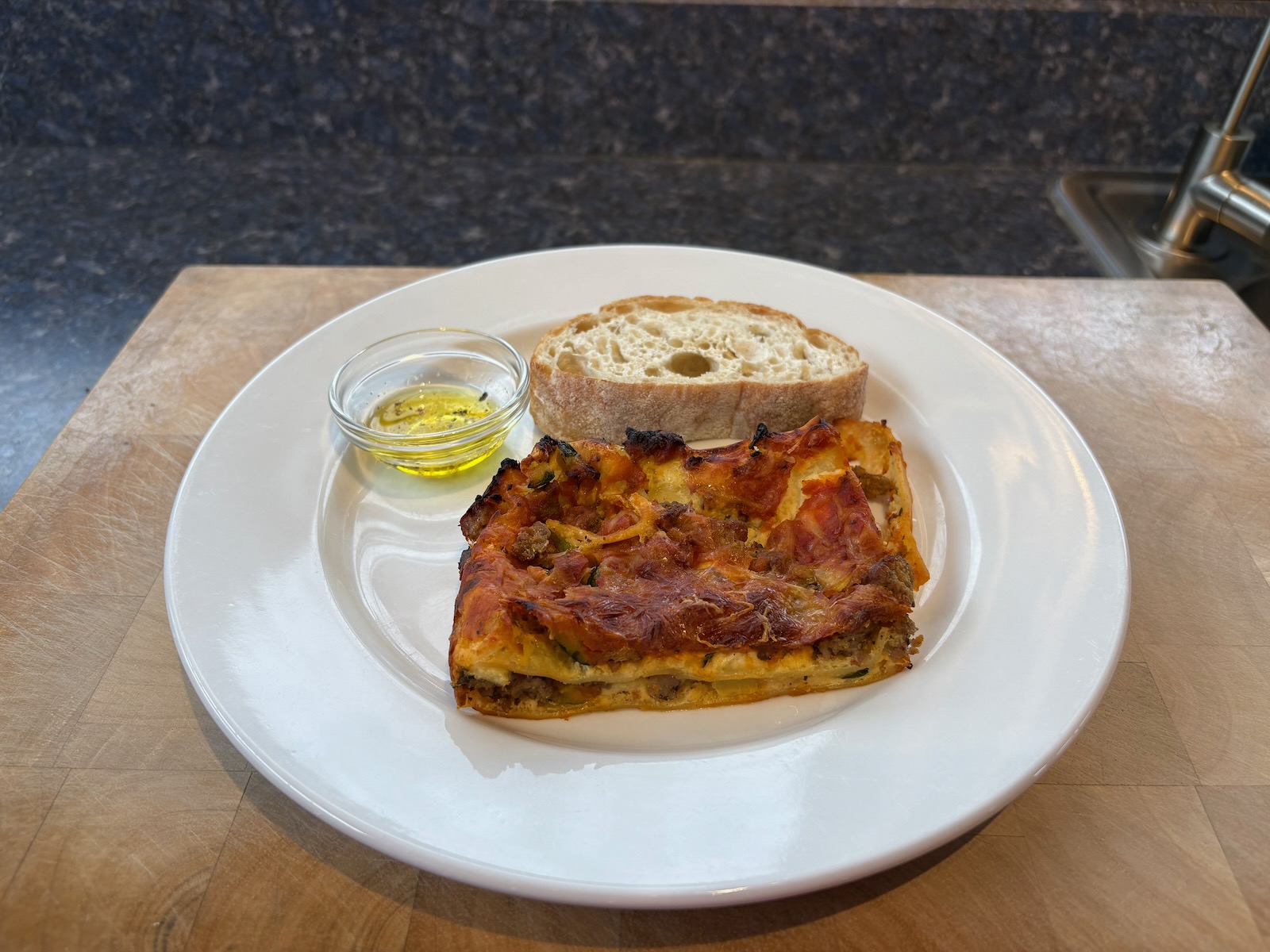 Dinner: Beef and zucchini lasagna #3. A piece of Wildgrain ciabatta bread with olive oil. A half glass of Bota Box cabernet sauvignon.