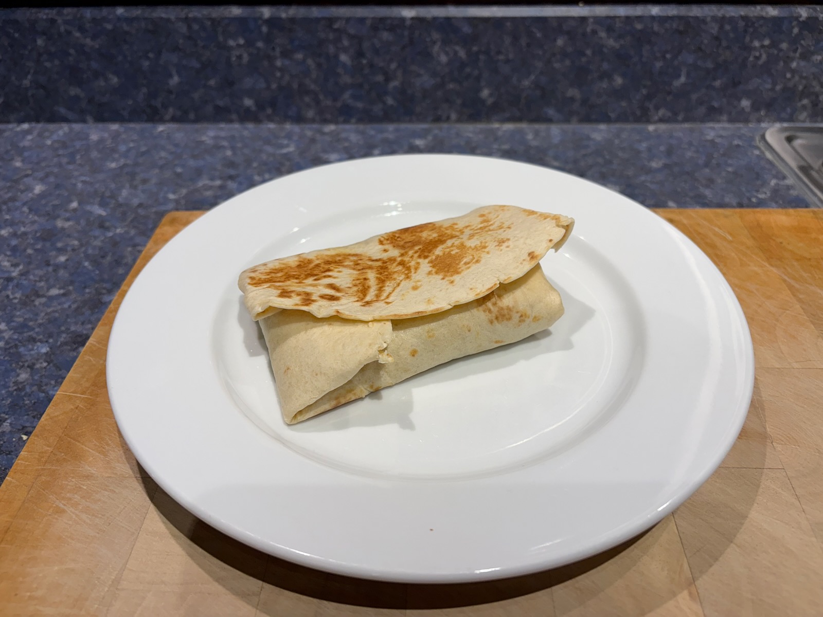 Breakfast: Chorizo breakfast burrito with chorizo, onion, green pepper, jalapeño, and egg. Reheat of the filling I cooked Saturday and froze, in a freshly heated flour tortilla.