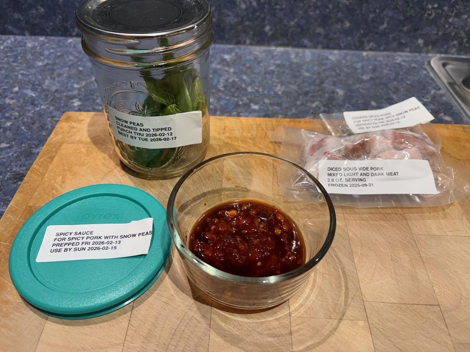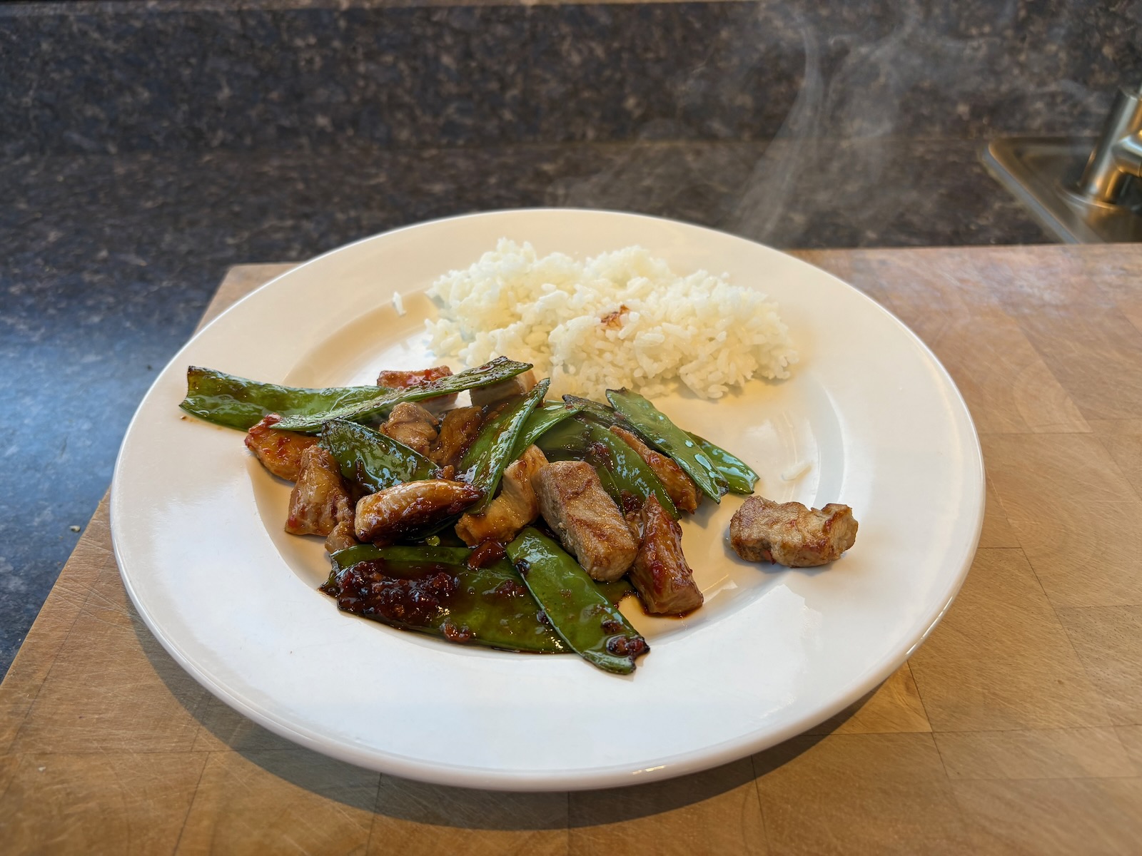 Dinner: Spicy pork with snow peas. Rice. Half glass of Bota Box sauvignon blanc.