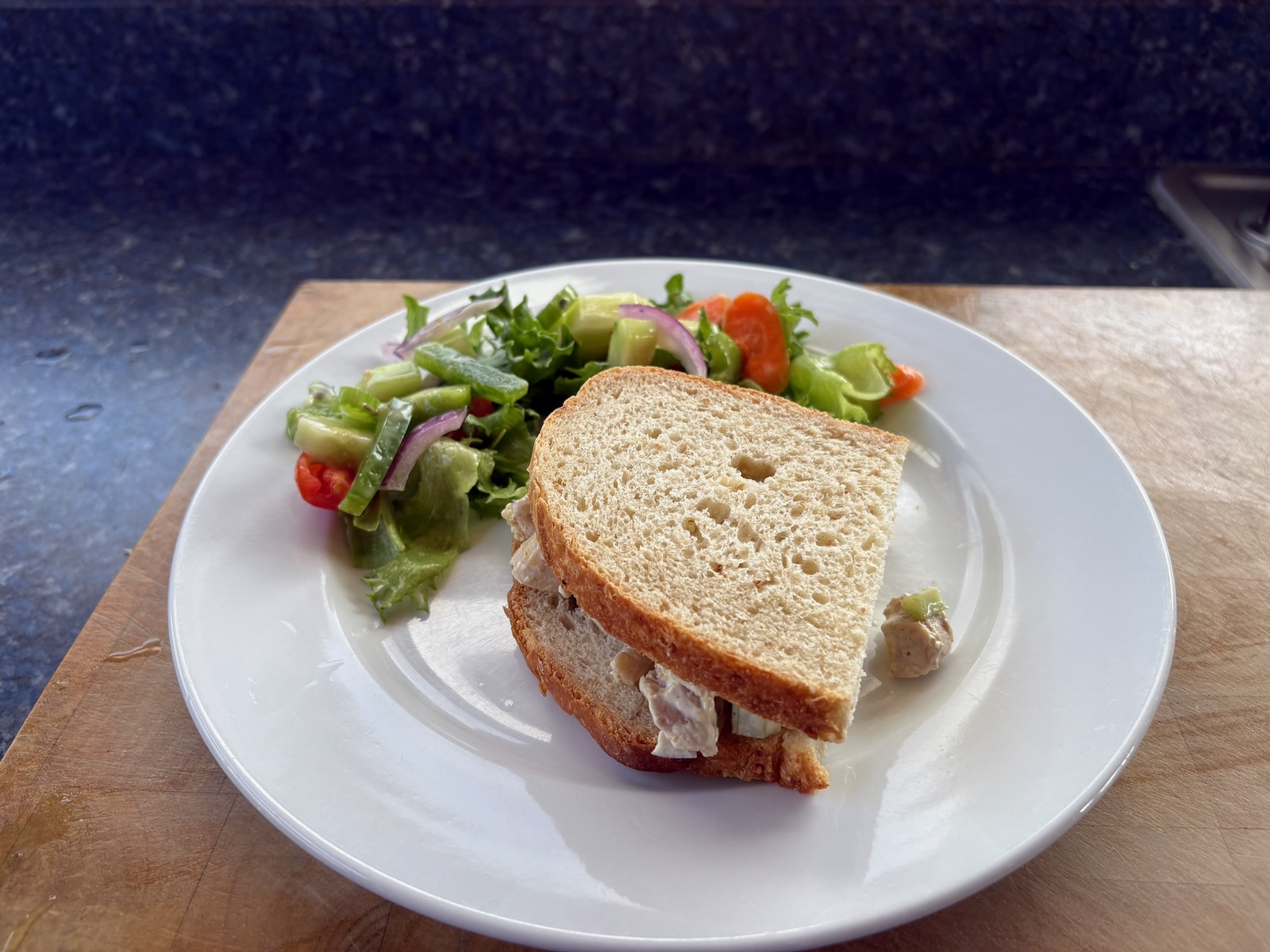 Lunch: Curry chicken salad sandwich with 2.0 oz. chicken on Heidelberg French peasant bread. Side salad with lettuce mix, cucumber, tomato, celery, red onion, and Annie's green goddess dressing.