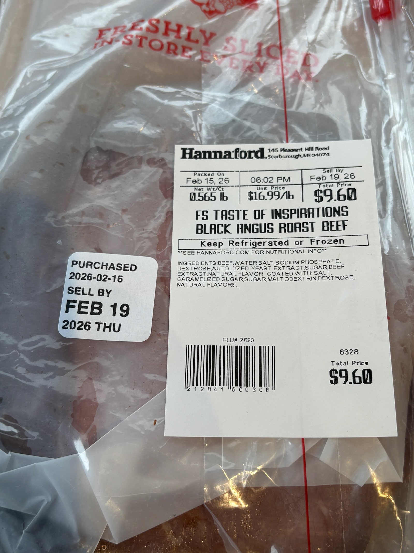 Got a 0.565 lb. (9 oz.) package of deli black angus roast beef. Divided into 4 packages of around 2.3 oz. each, vacuum sealed and frozen. Saved one refrigerated serving for Wednesday's lunch.
