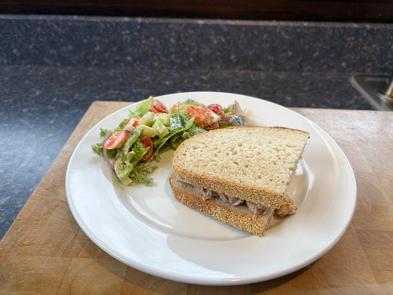 Lunch: Spicy tuna salad sandwich on Heidelberg French peasant bread. Salad with lettuce mix, cucumber, tomato, carrot, celery, green pepper, red onion, and chipotle ranch dressing (20 grams, 93 cal).