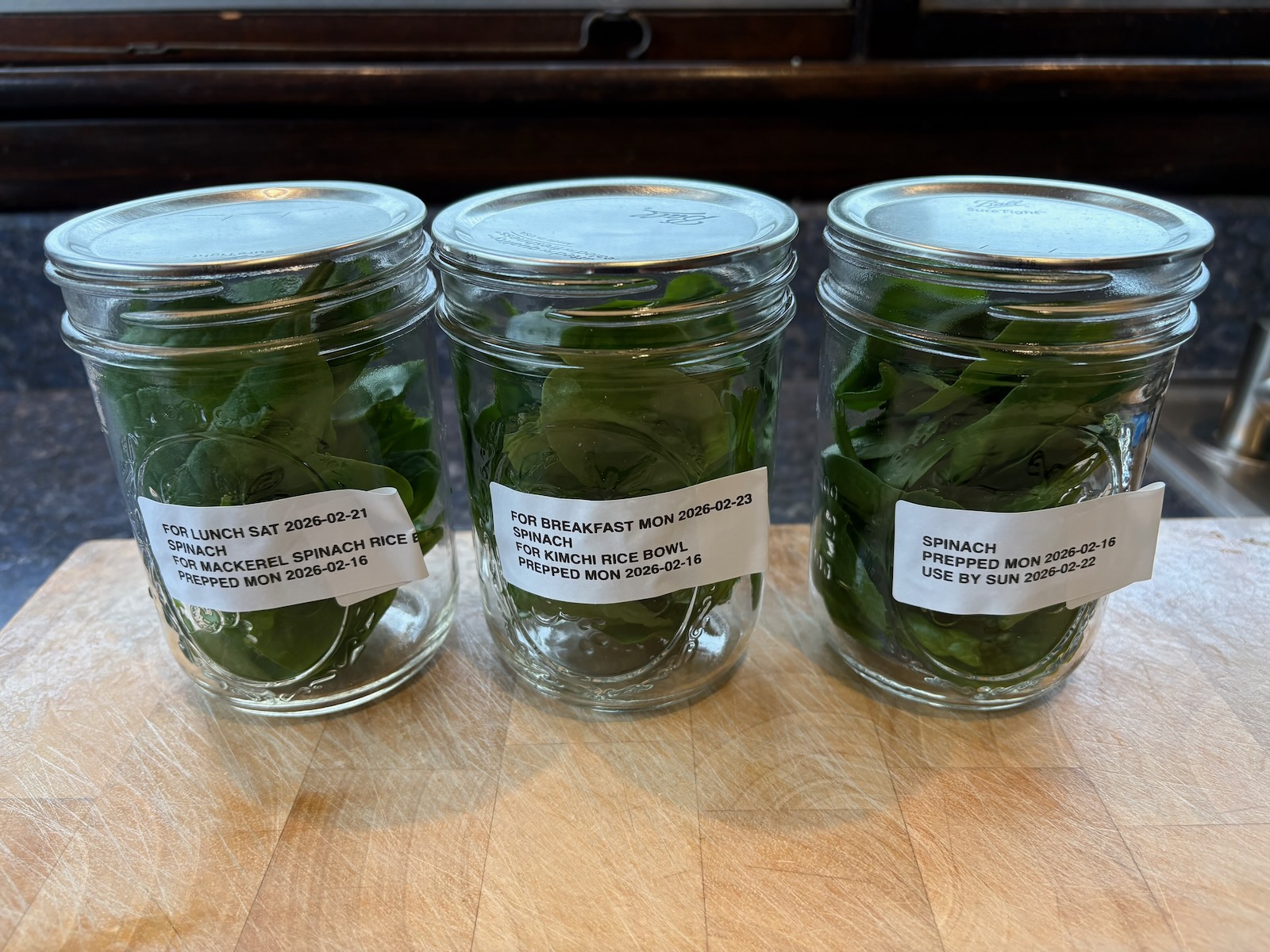 Prepped, vacuum sealed, and refrigerated jars of spinach.