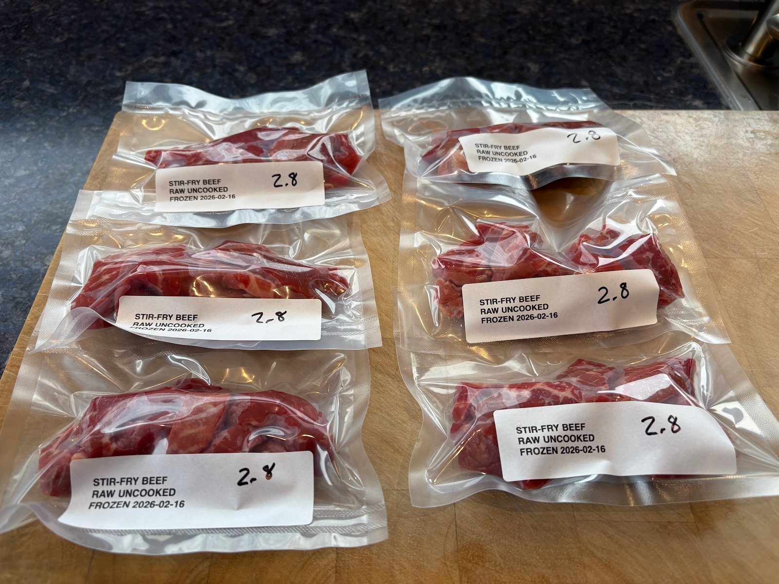 Divided a 1.09 lb. (17.4 oz). package of stir-fry beef into 6 packages of 2.8 oz. each. Vacuum sealed and froze raw.
