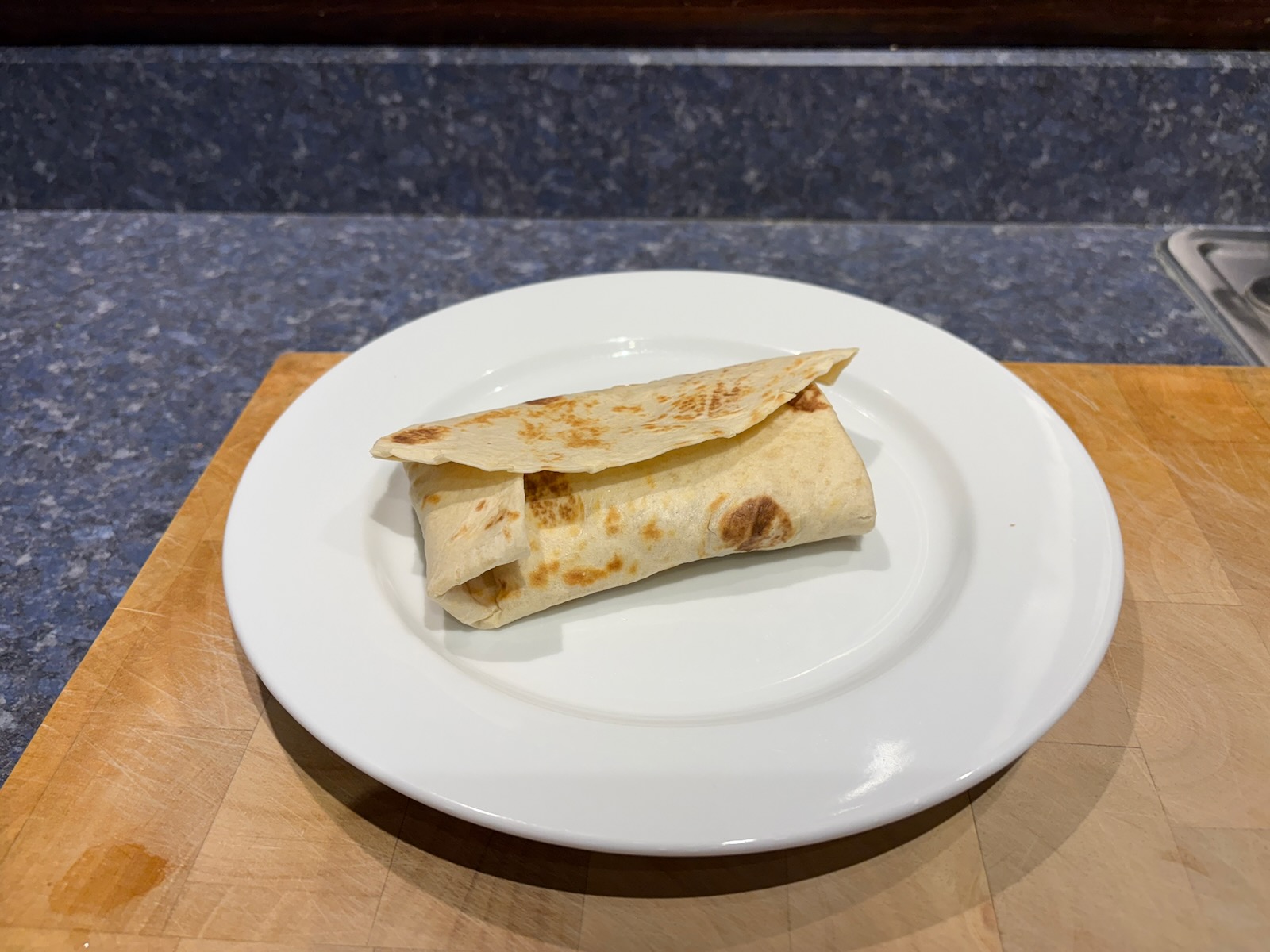 Breakfast: Chorizo breakfast burrito with chorizo, onion, green pepper, jalapeño, and egg. Reheat of the filling I cooked Saturday and froze, in a freshly heated flour tortilla.