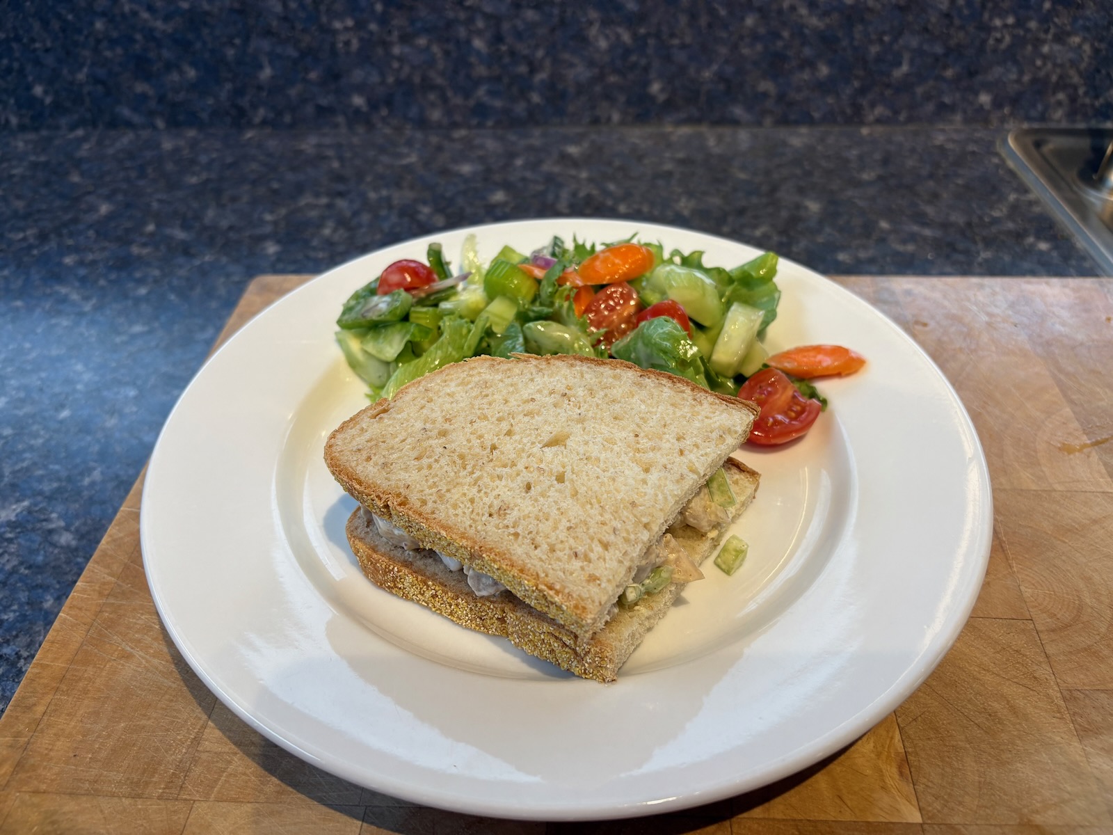 Lunch: Curry chicken salad sandwich with 2.0 oz. chicken on Heidelberg French peasant bread. Side salad with lettuce mix, cucumber, tomato, celery, red onion, and Annie's green goddess dressing.