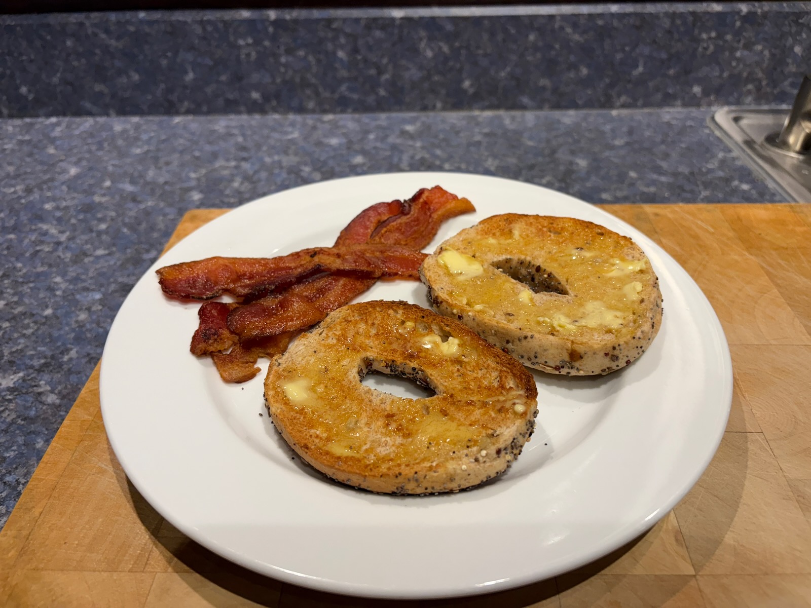 Breakfast: Toasted everything bagel with butter. Side of bacon.