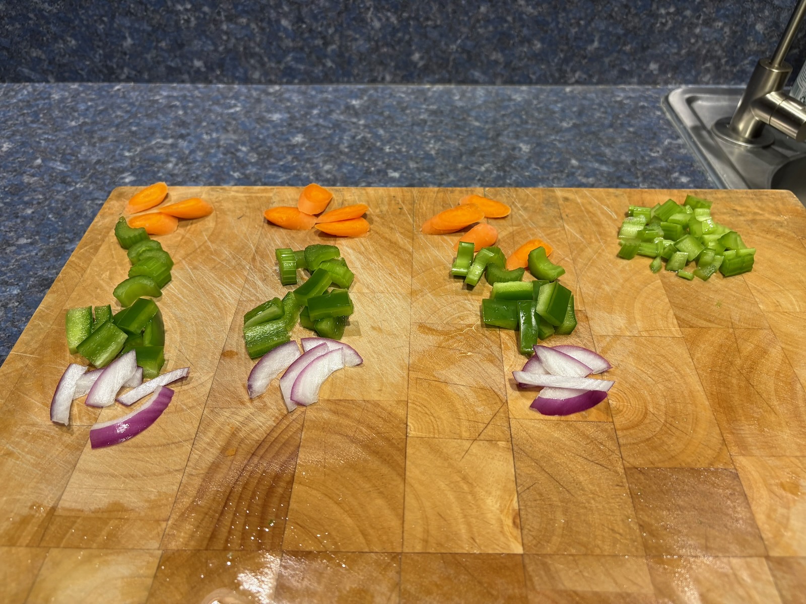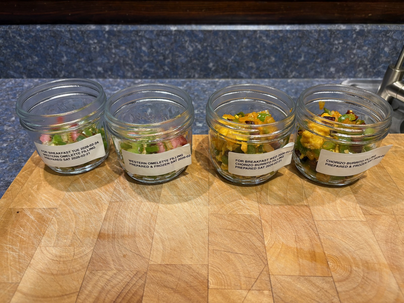 Made the filling for an spicy western omelette for Tuesday and froze one more serving. Make the filling for chorizo breakfast burrito with chorizo, onion, green pepper, jalapeño, and egg for breakfast Wednesday. Froze the serving for next Friday.