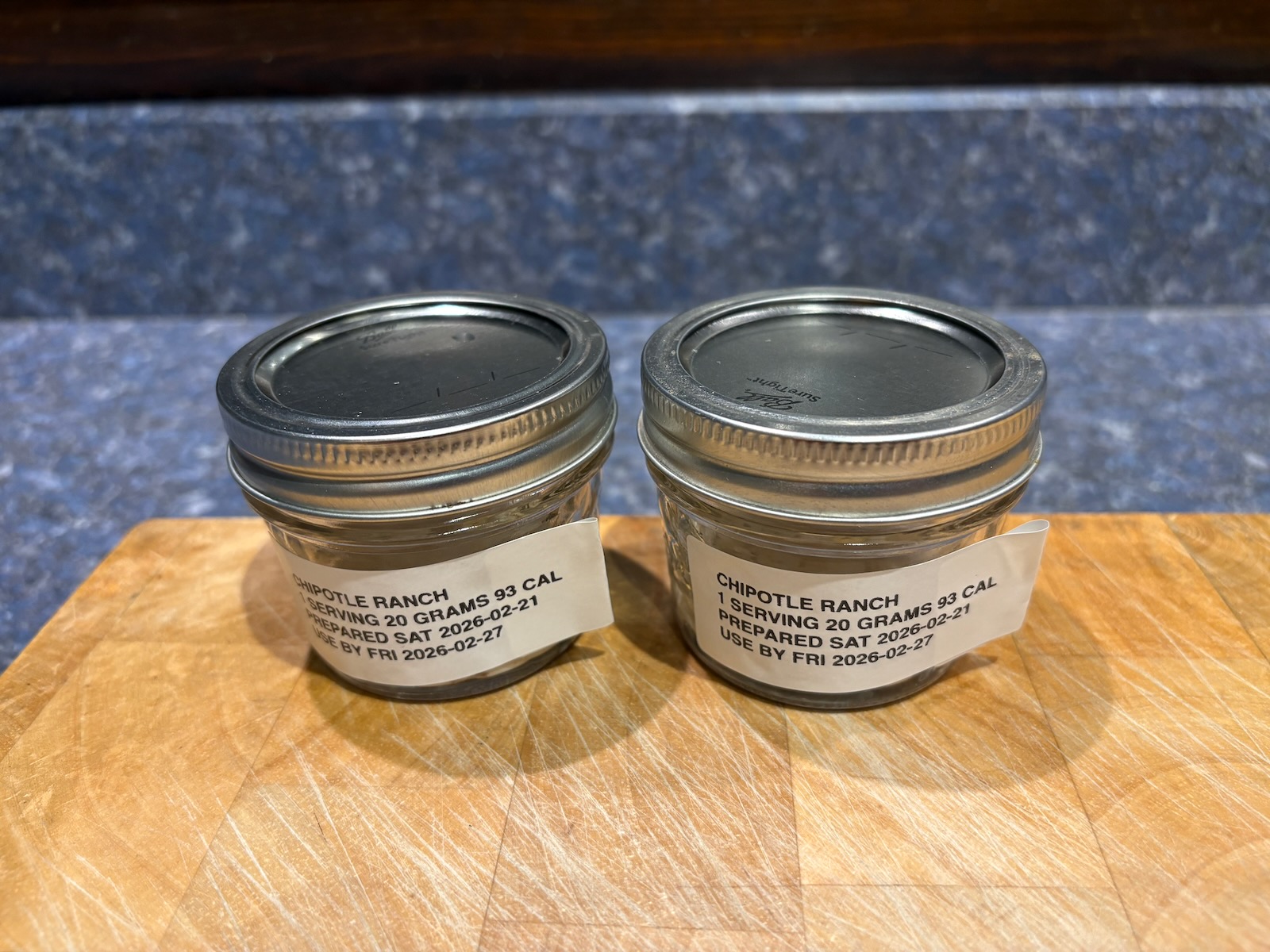 Prepped 2 servings of chipotle ranch salad dressing, 20 grams, 93 calories each.