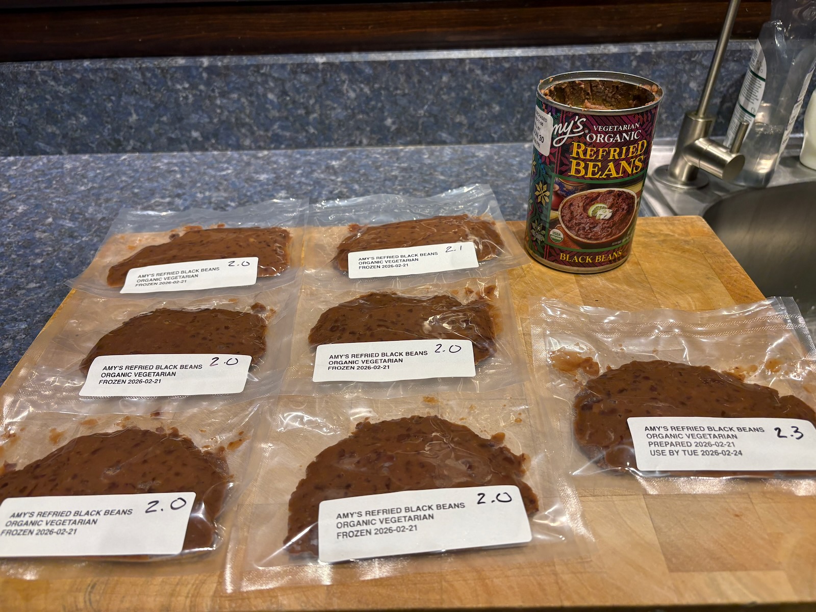 Divided a can of refried black beans. Kept one serving for for breakfast tomorrow, vacuum sealed and froze the remainder.