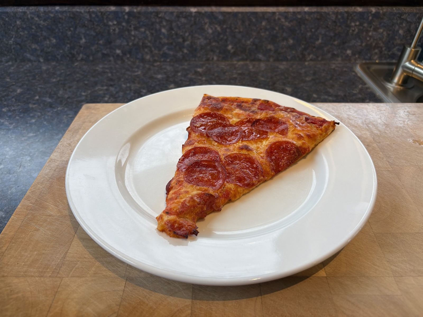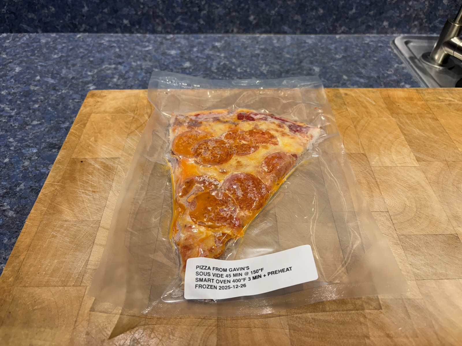 Dinner: 1 slice of Pepperoni pizza from Gavin's in Sidney, NY. It was vacuum sealed and frozen so I reheated it from frozen in the sous vide at 140°F, then transferred it to the Breville SmartOven, 400°F for 3 minutes, plus the preheat time, on a sheet pan.