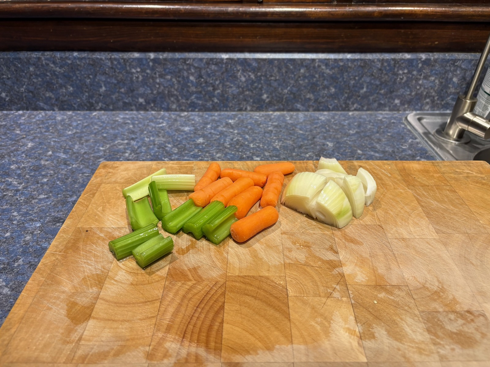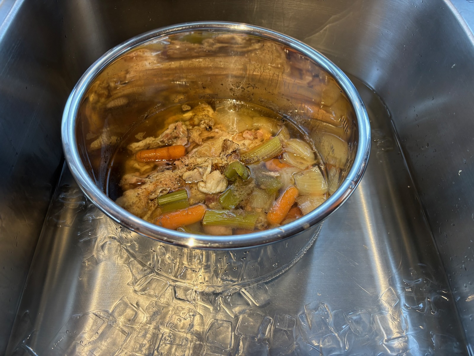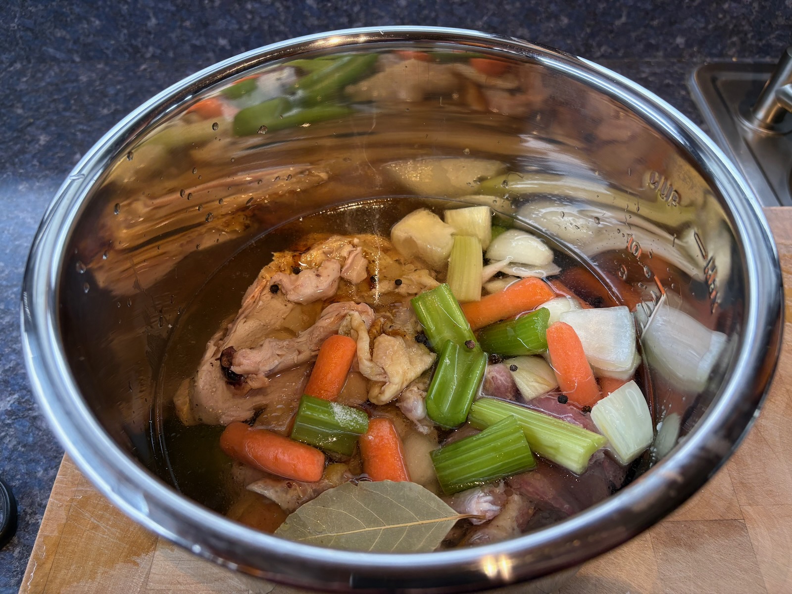 Made chicken stock. Today was the day the celery and baby carrots were replaced, and stock is a great way to use the remnants.
