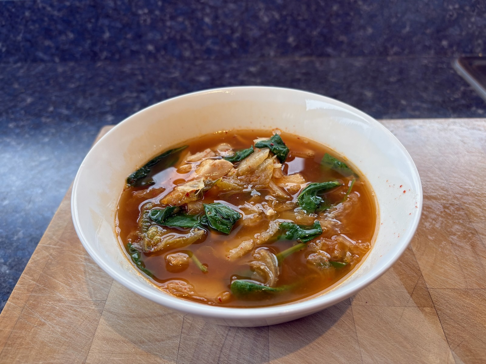 Lunch: Chicken kimchi soup. With 12 oz. chicken stock, 2.0 oz. chicken, kimchi, and spinach. A half glass of Bota Box sauvignon blanc.