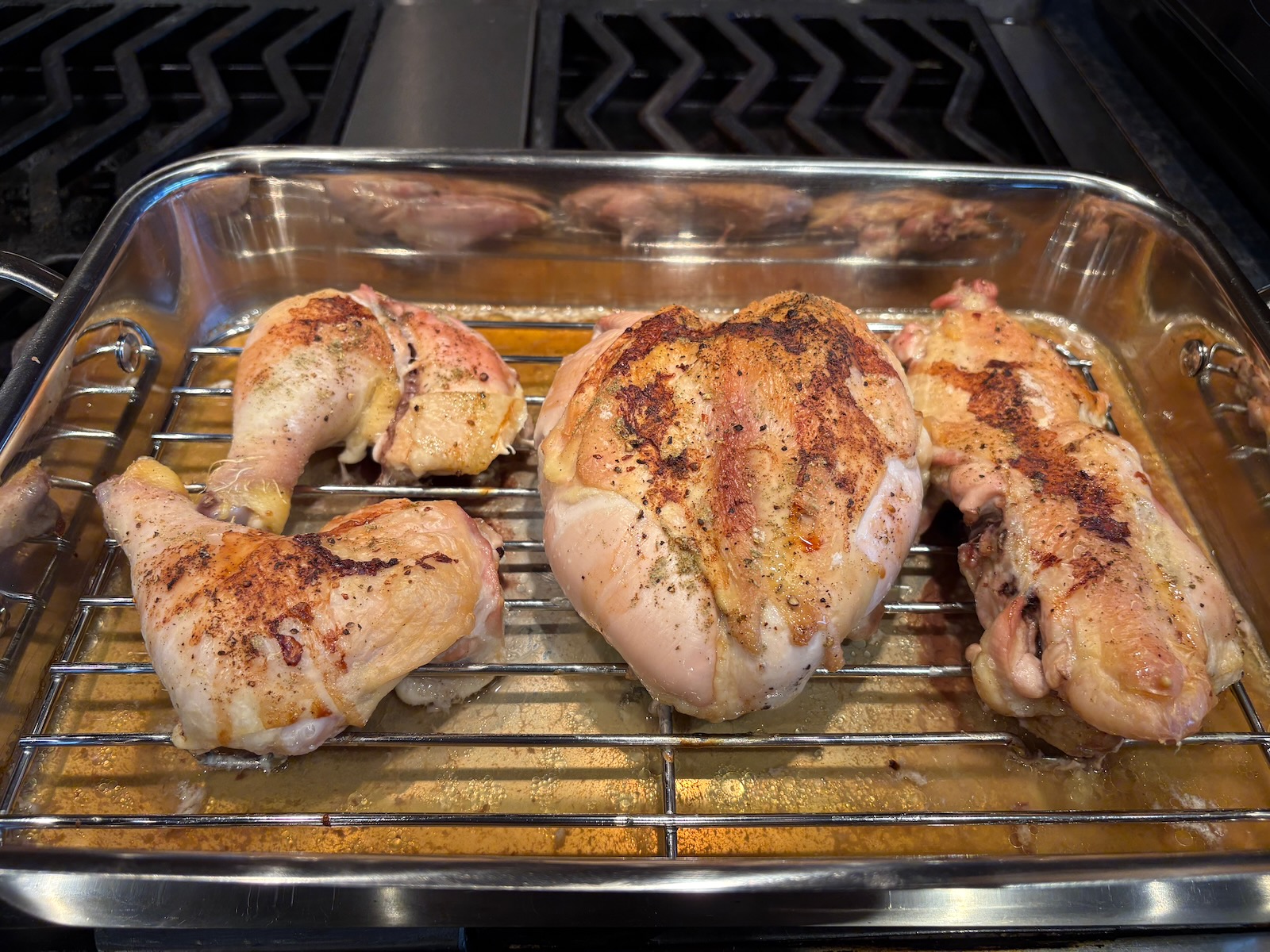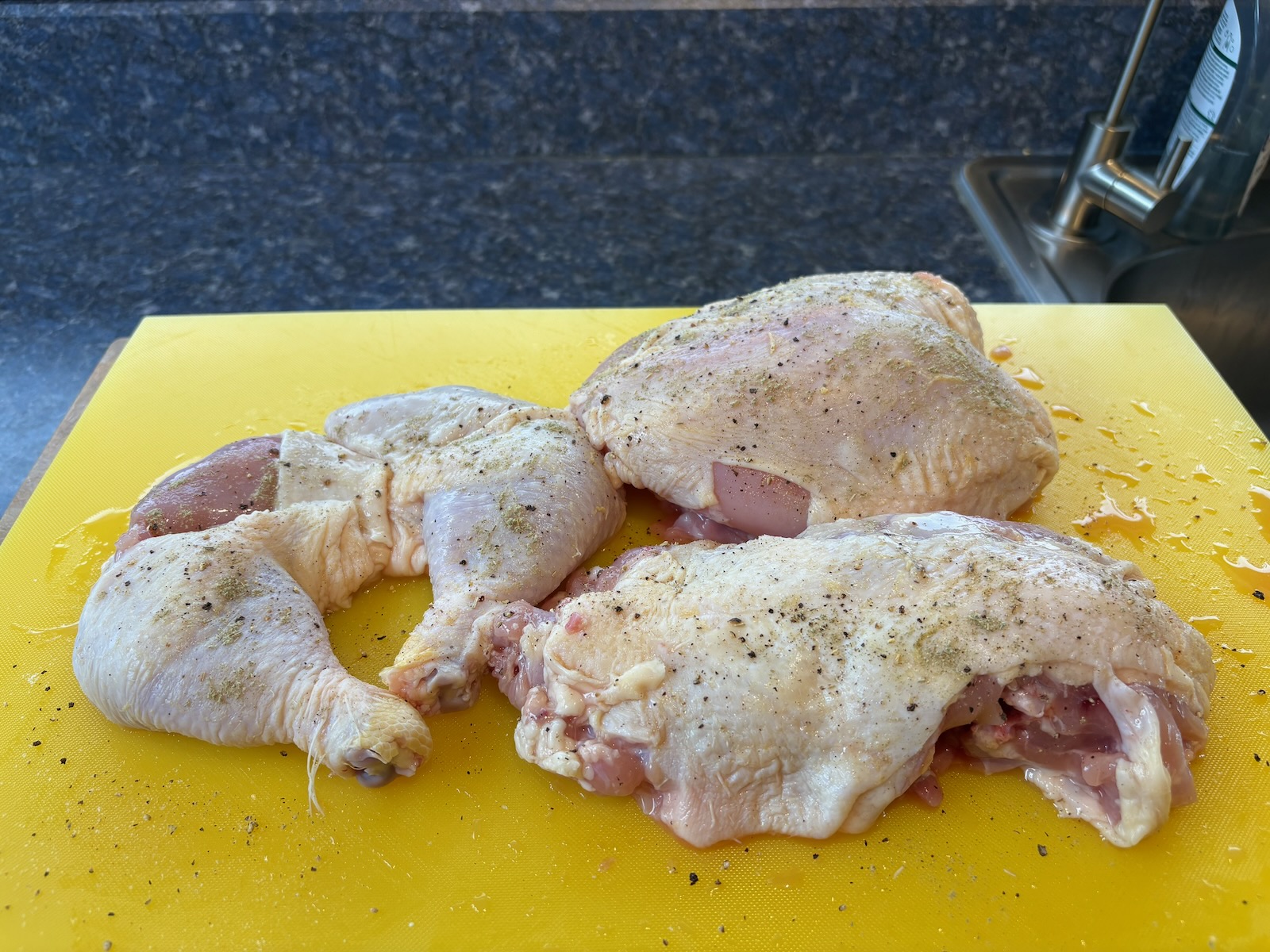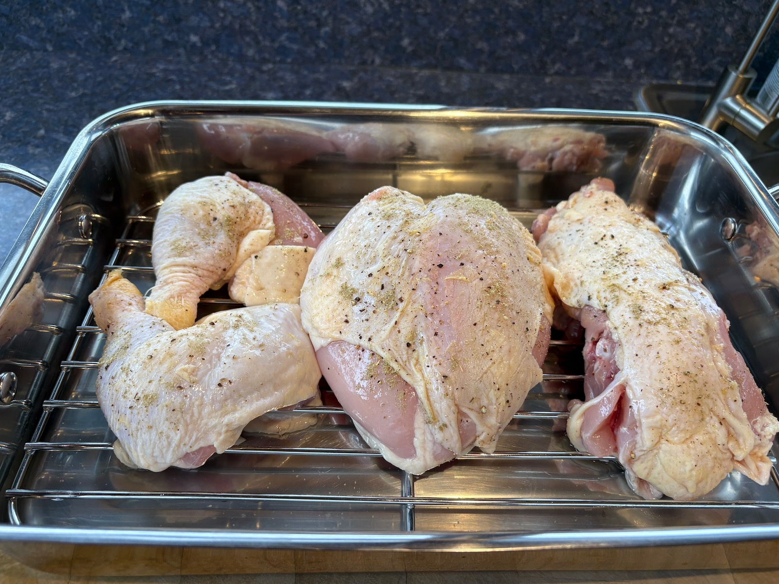 Broke down the whole chicken into parts, seasoned with salt, black pepper, garlic powder, and sage.