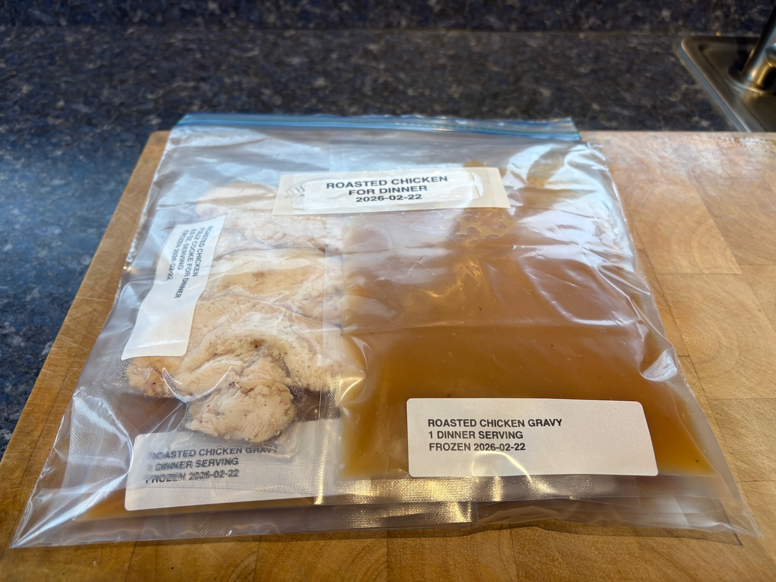 Chicken and gravy packaged for dinners.